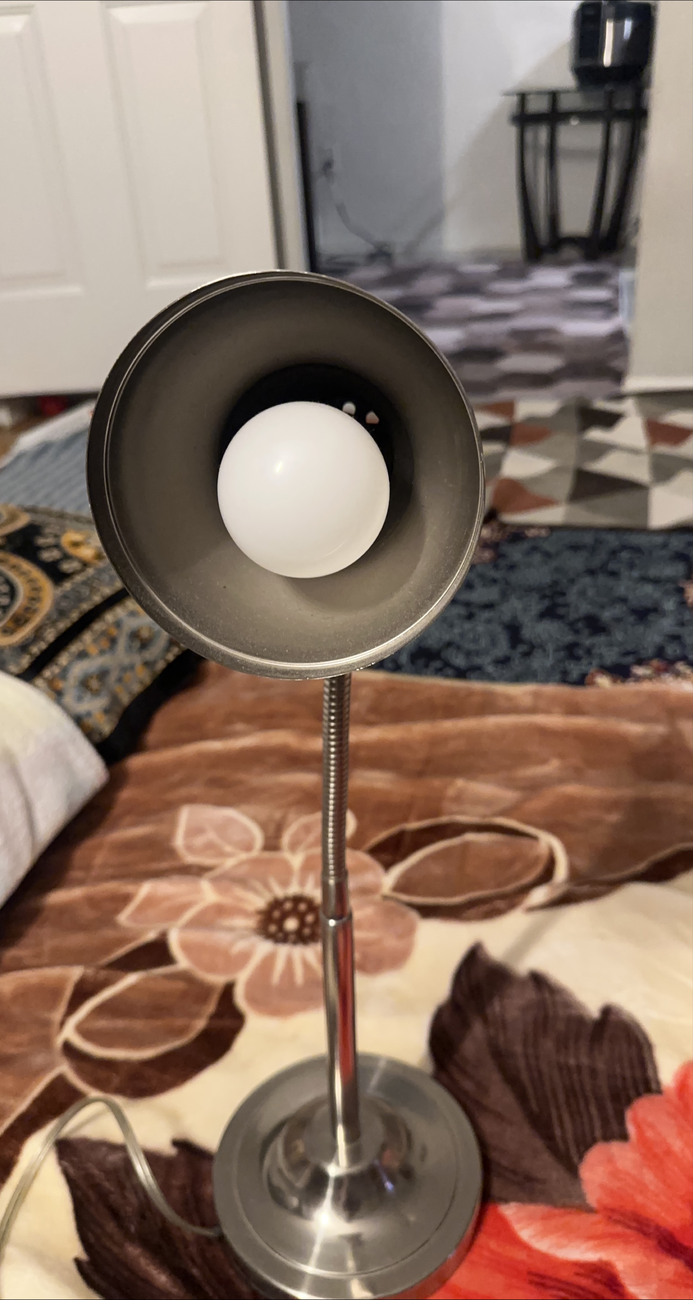 Selling a silver desk lamp! It's in good condition and would be perfect for a student or anyone who needs a little extra light. The lamp has a flexible neck so you can adjust the light to exactly where you need it.