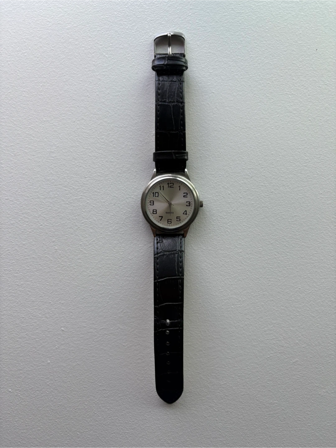 Selling a classic watch with a silver face and a stylish black leather strap. It's in great condition Needs battery replacement