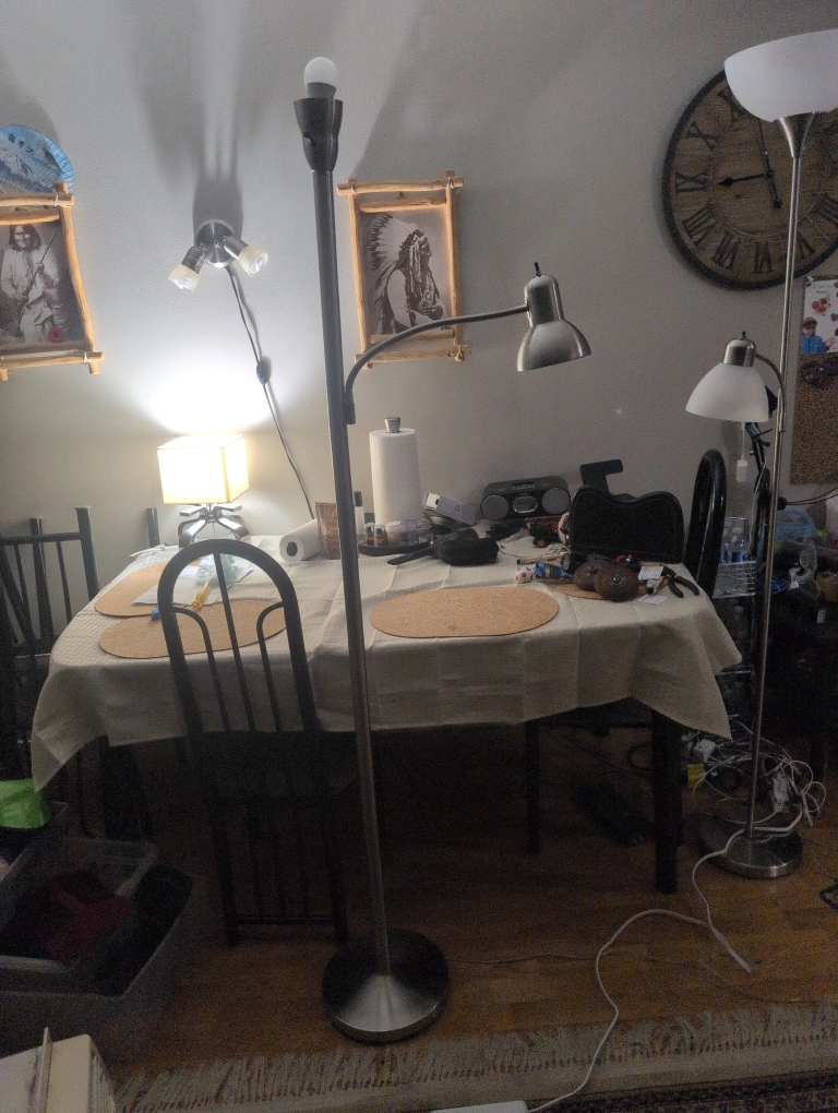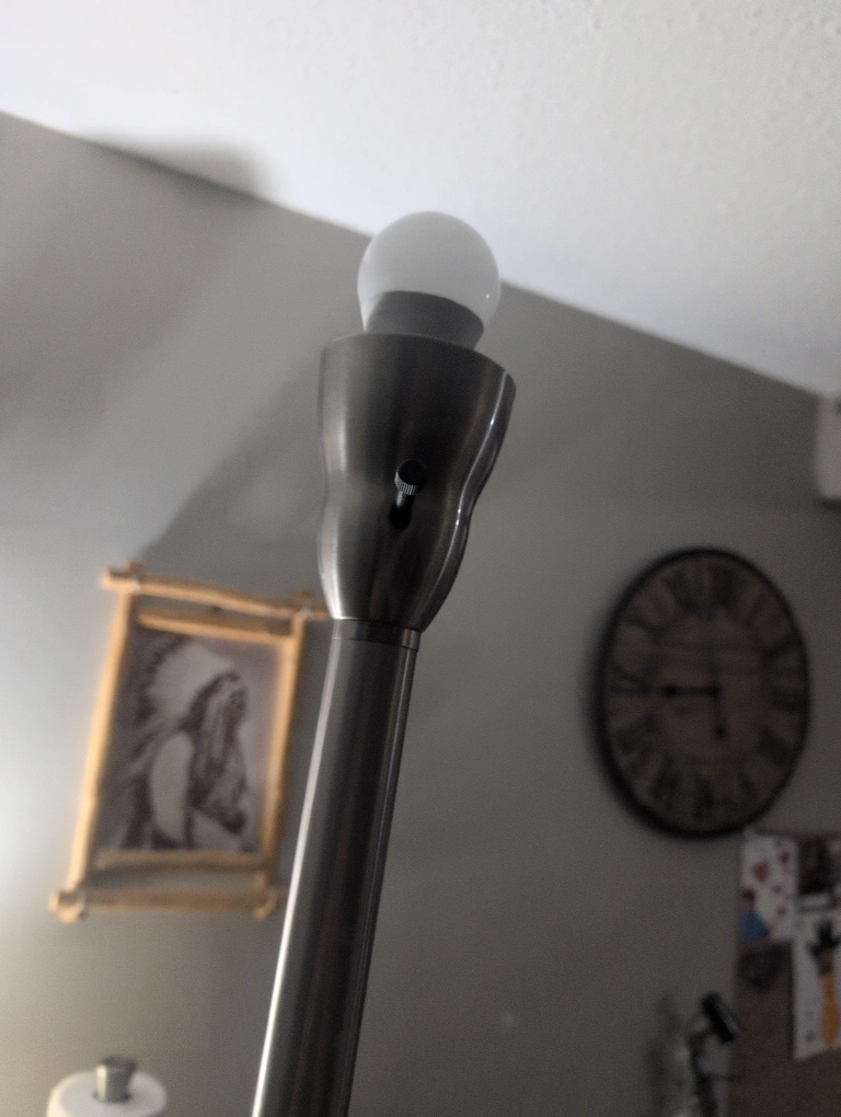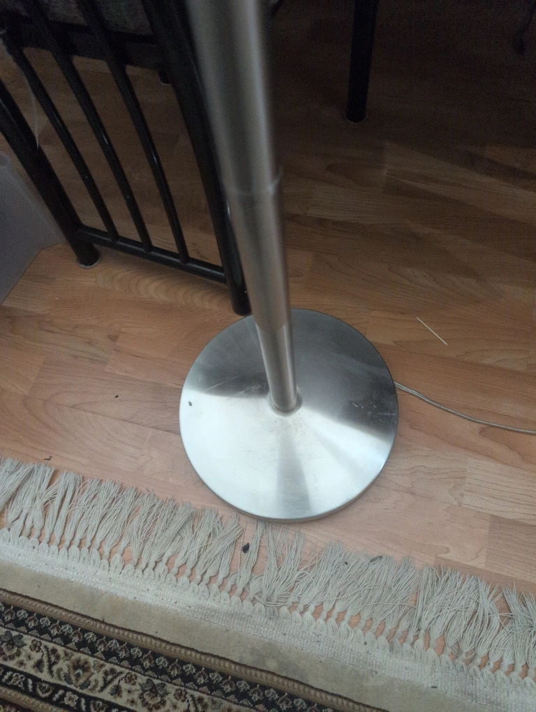Selling a floor lamp in good condition! It features a main light at the top and an adjustable reading light on the side, perfect for any room in your home. The base and pole are silver.I have two pieces.