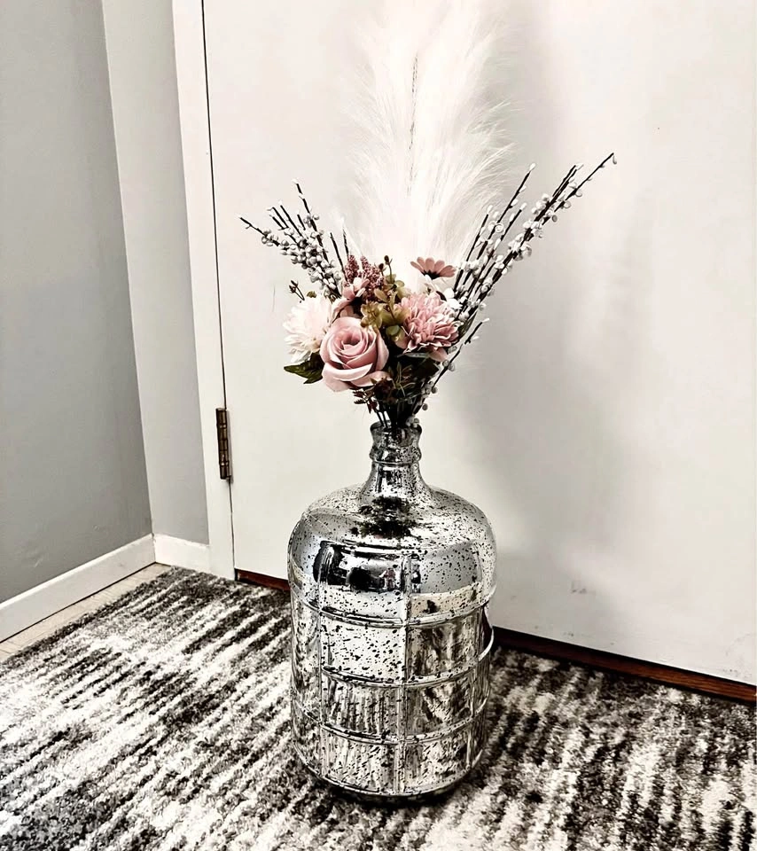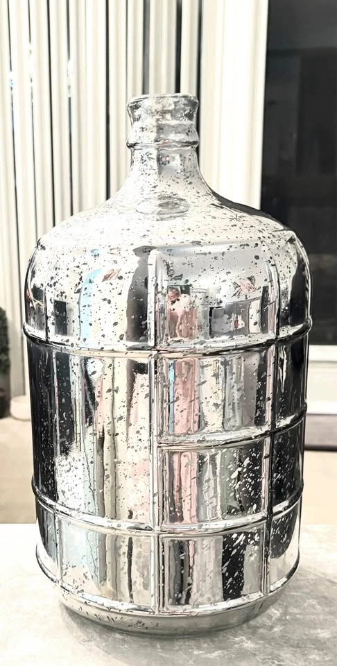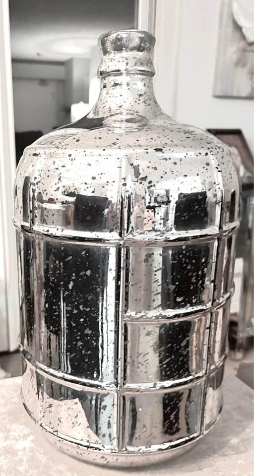 This floor vase was purchased at a furniture store. It is made of glass and fairly heavy. Painted in shiny silver with flecks of grey/black. Attractive vase for faux flowers or branches. Ideal for Christmas greenery and seasonal decor. In perfect condition - no chips, scratches or damage. The vase measures approx. 17 inches high. The top opening is 2.25 inches across and the body of the vase measures approx. 9 inches across. PICK UP ONLY, PLEASE Nearest intersection is Brant Street/Upper Middle Road in Burlington.
