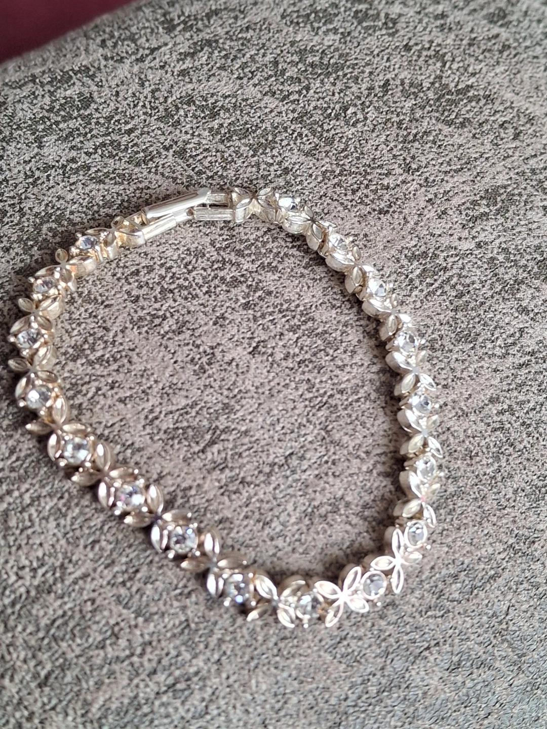Elegant silver bracelet. Features a delicate floral design accented with clear crystals. Clasp closure. Lovely piece for any occasion.