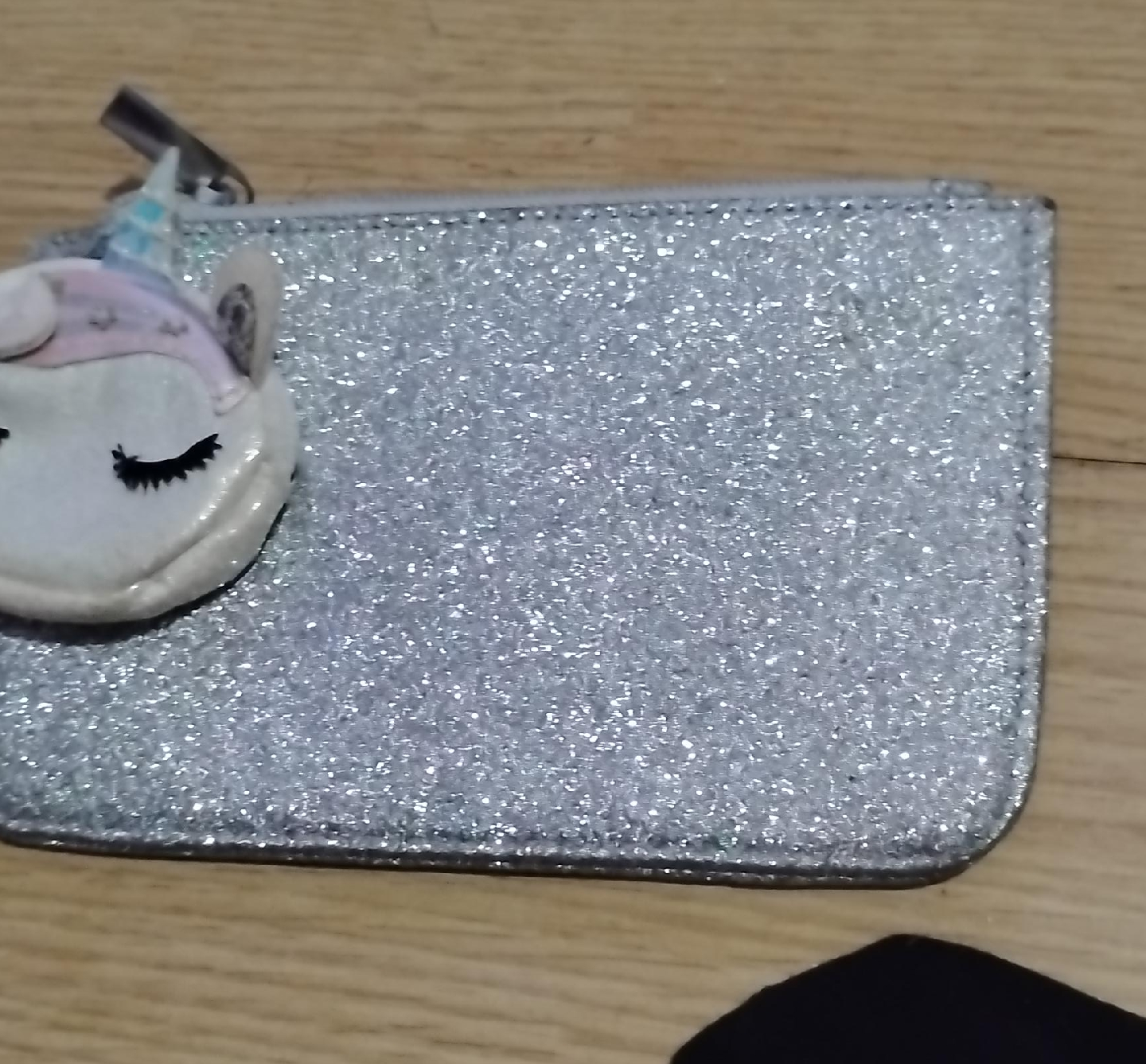 Cute silver glitter pouch with a unicorn design! Perfect for holding small items or as a coin purse. It's in great condition and ready for a new home