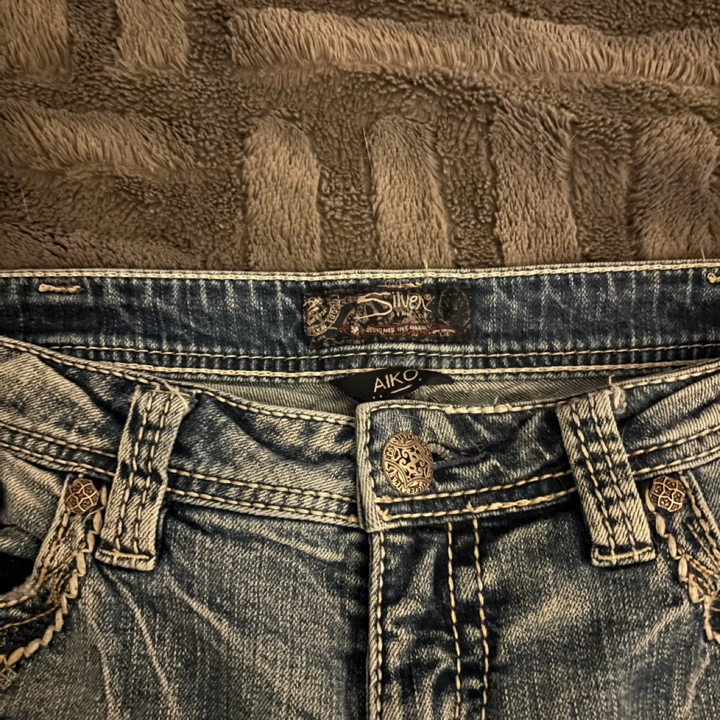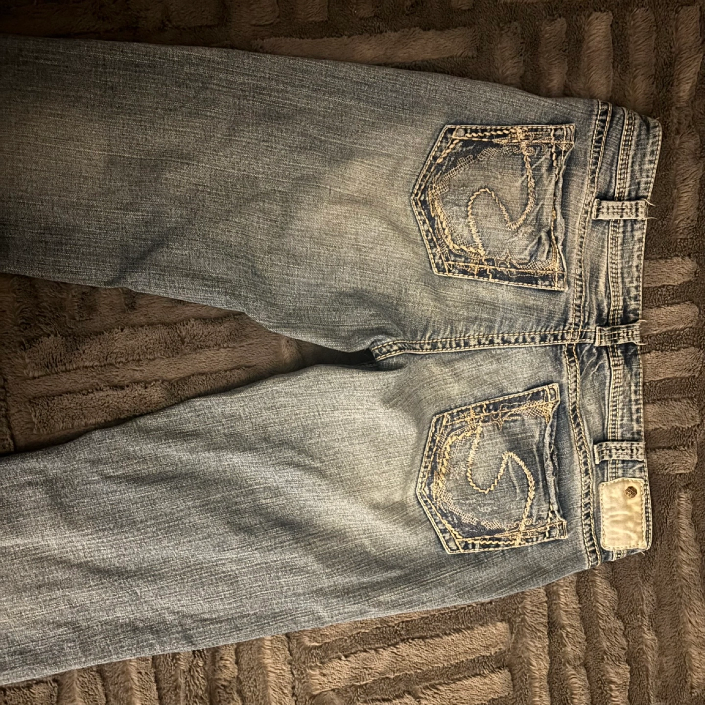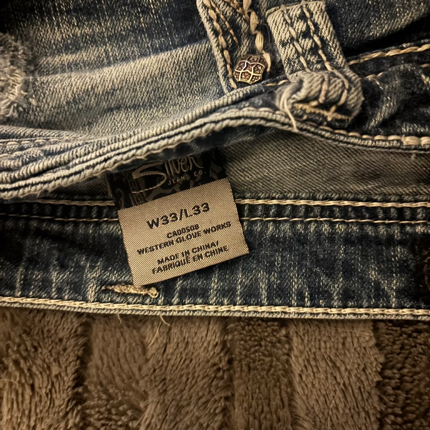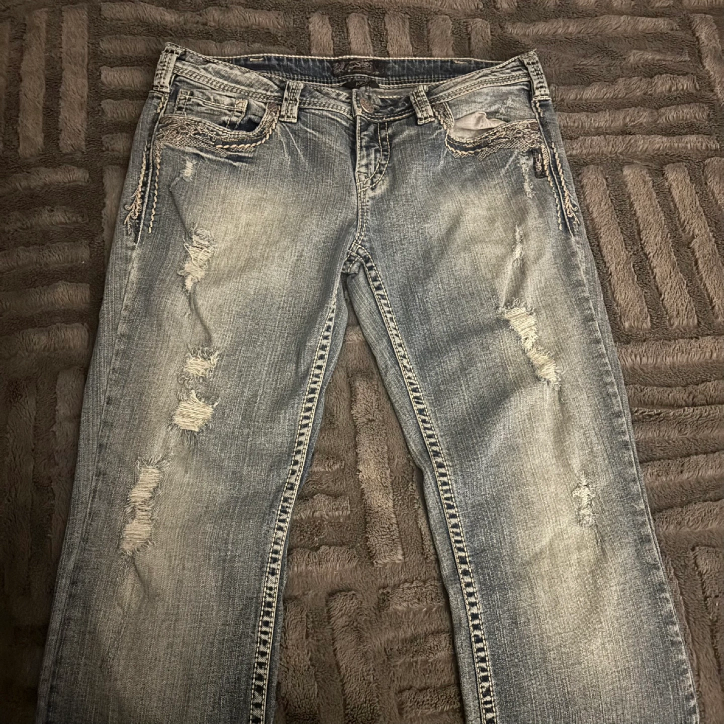 Women's Silver Jeans Co. distressed jeans. Size W33/L33. Light wash denim. Features decorative stitching and embellishments.
