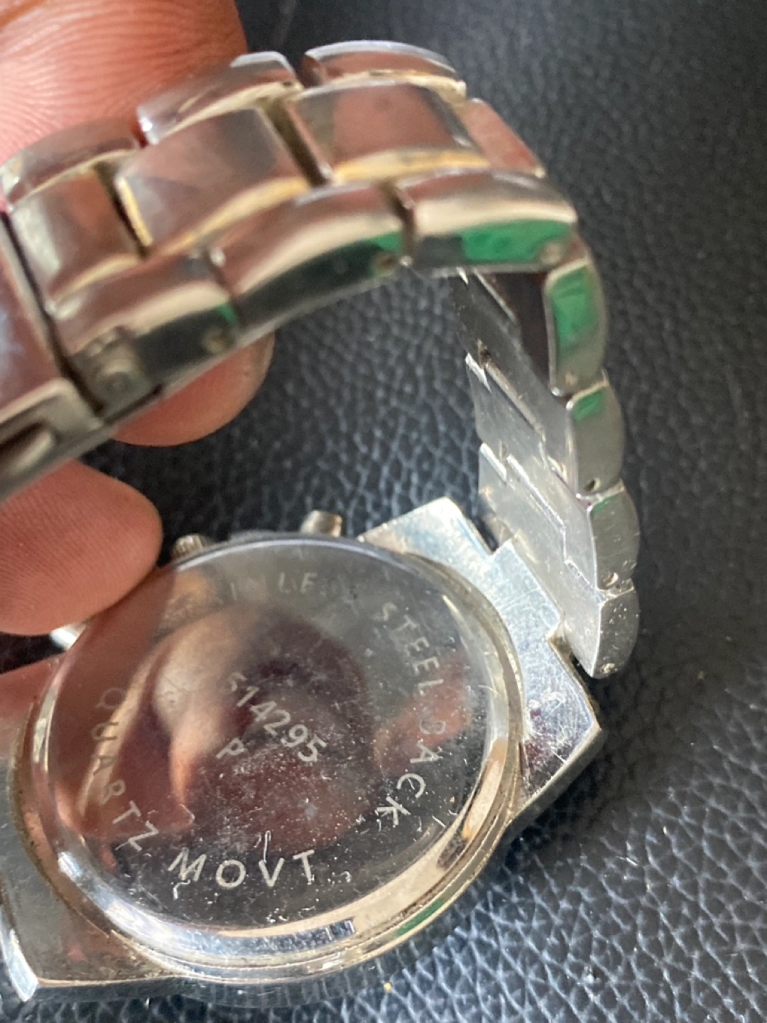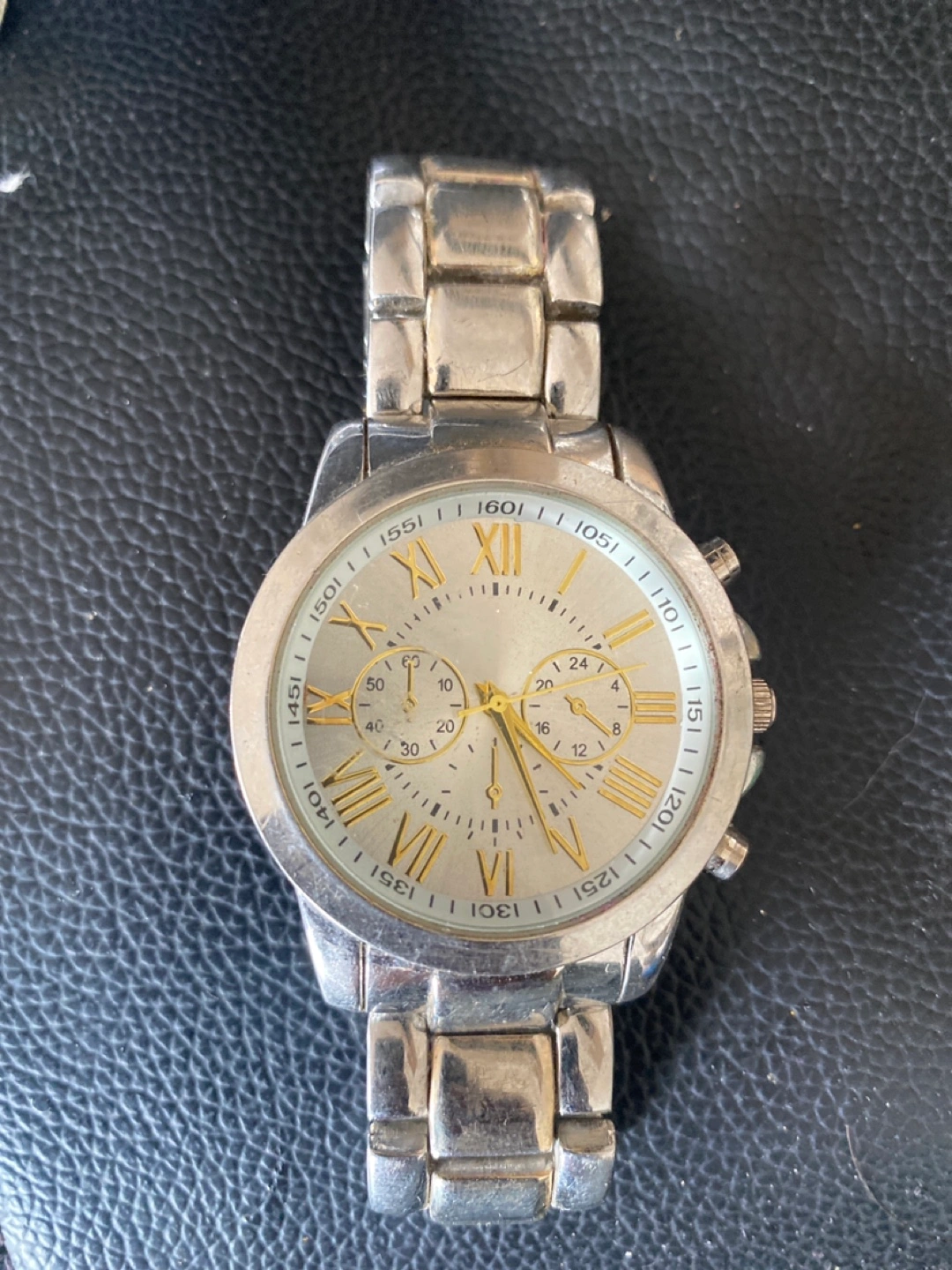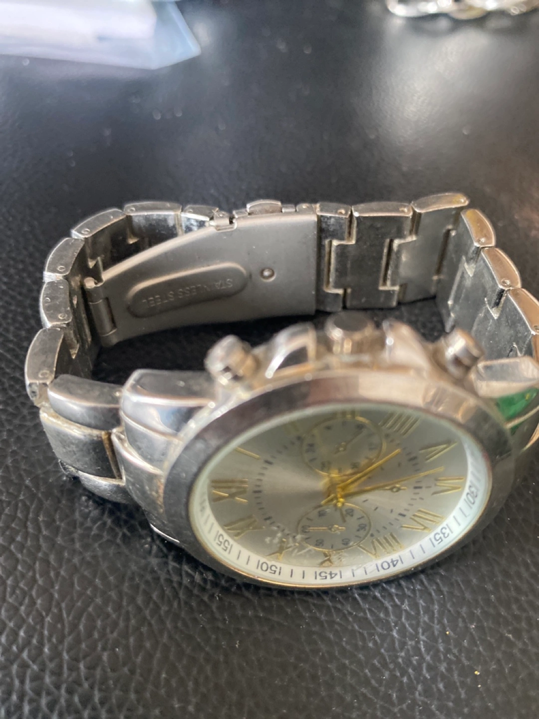 Selling a silver-tone men's watch. It has a stainless steel band and a quartz movement. The watch has a chronograph dial with gold-tone hands and markers. It's in good condition and ready for a new owner!