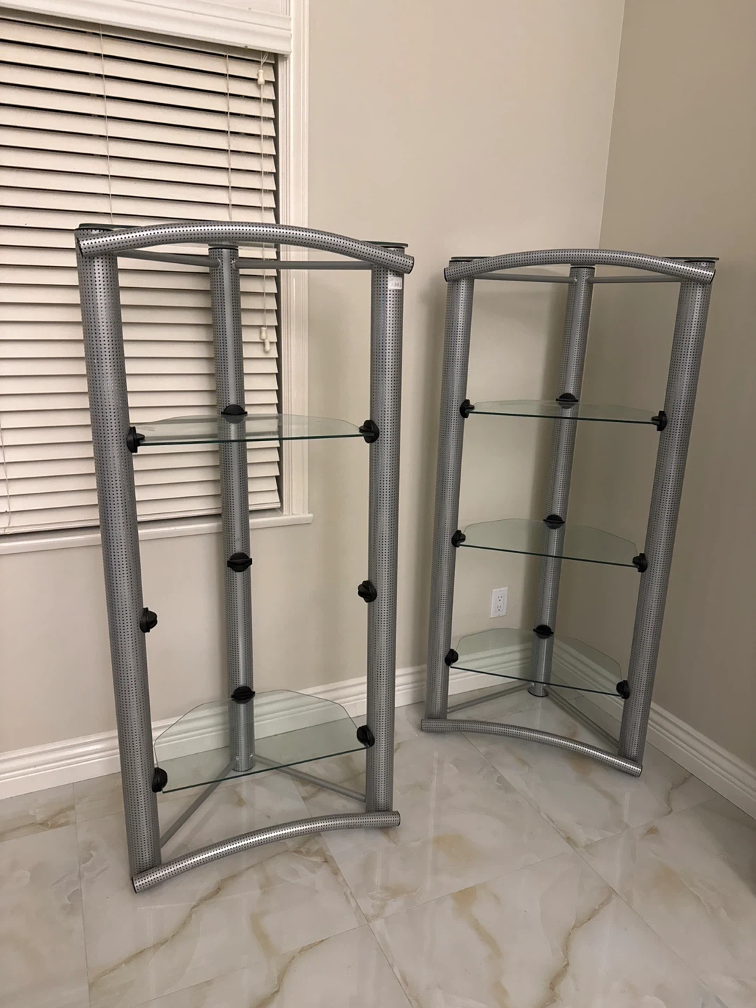 Selling a set of two corner shelves! These have a silver metal frame with glass shelves. They're in great shape and would be perfect for displaying items in a living room or office. They can be sold separately too $60 for the one with 3 glasses and $20 for the one with two glasses or $70 for both.