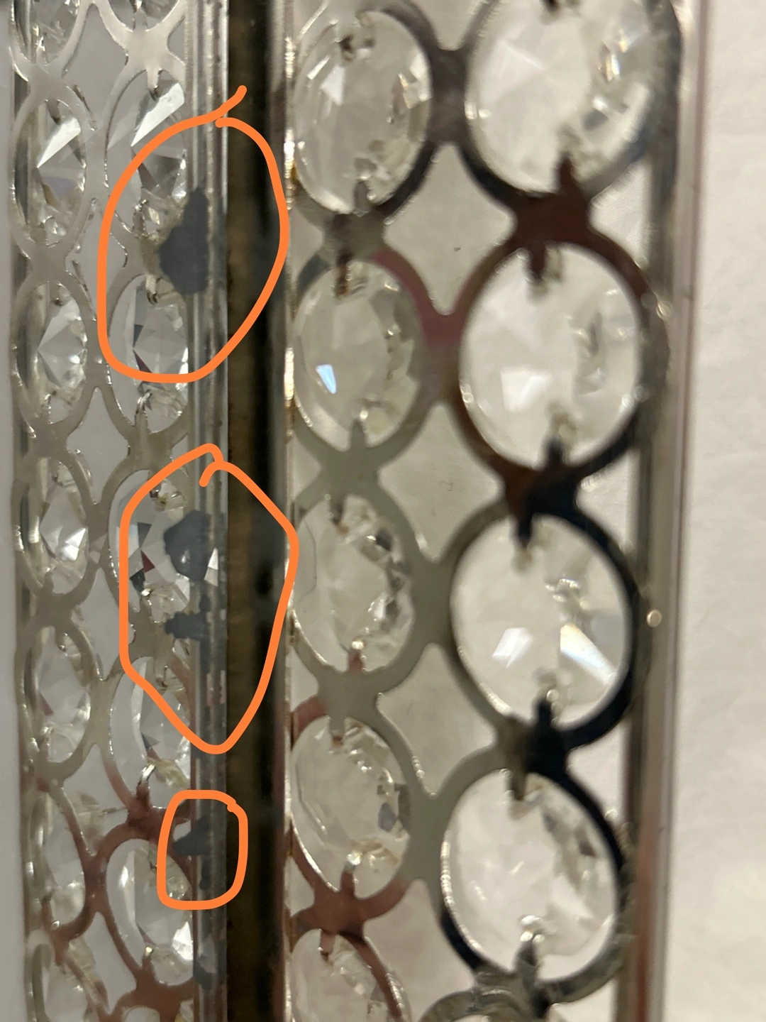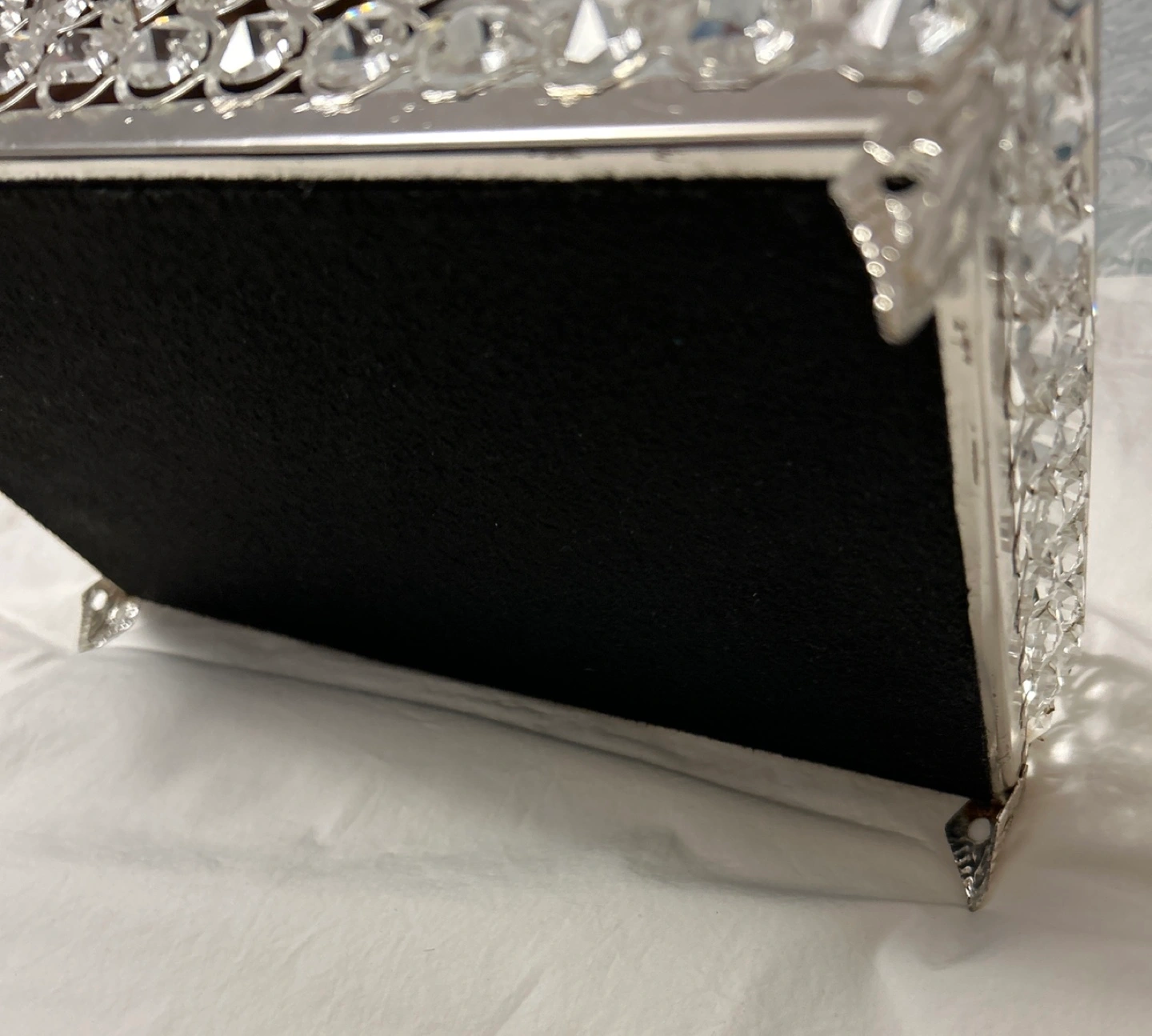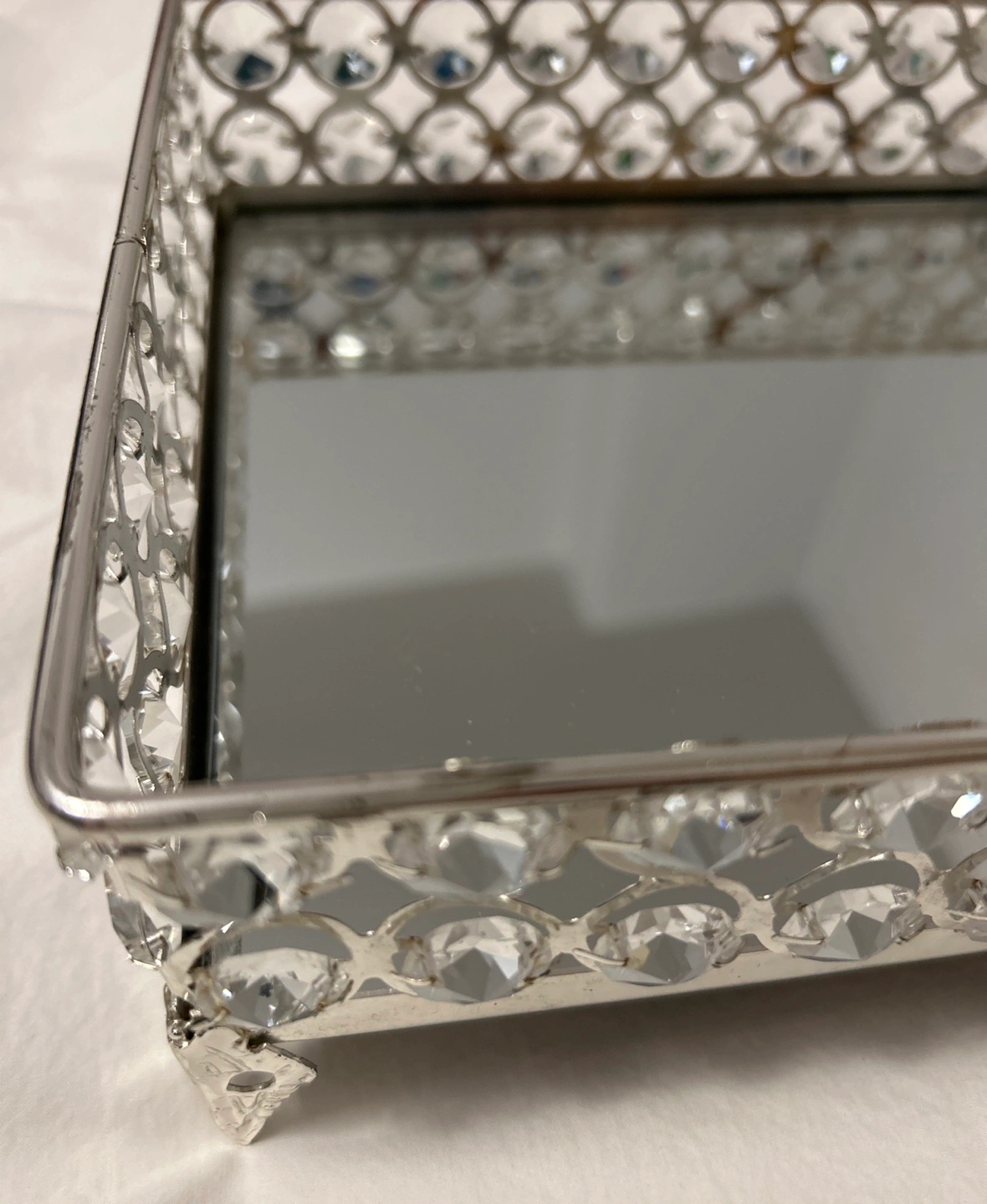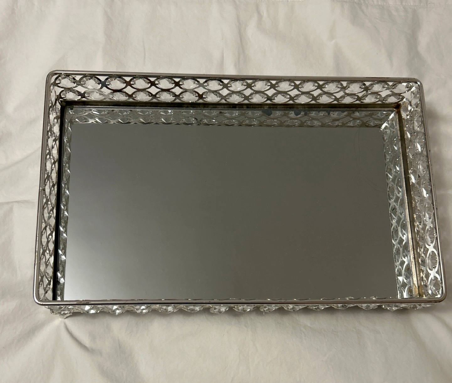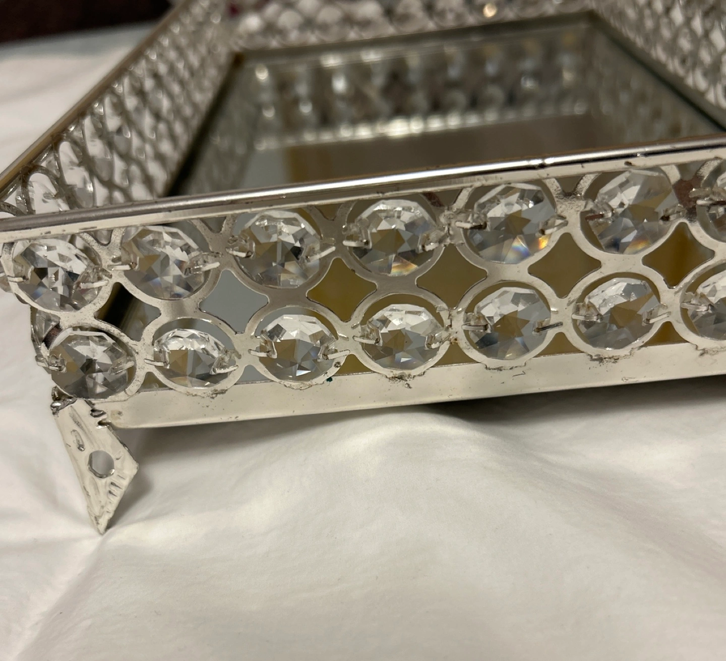 Rectangular mirrored tray. Silver metal frame. Crystal embellishments around the perimeter. Four small feet on the bottom. Clean and no damage. Minor dark imperfections in the mirror. Check photos please. Smoke and Pet free home. Cash and pick up only please.