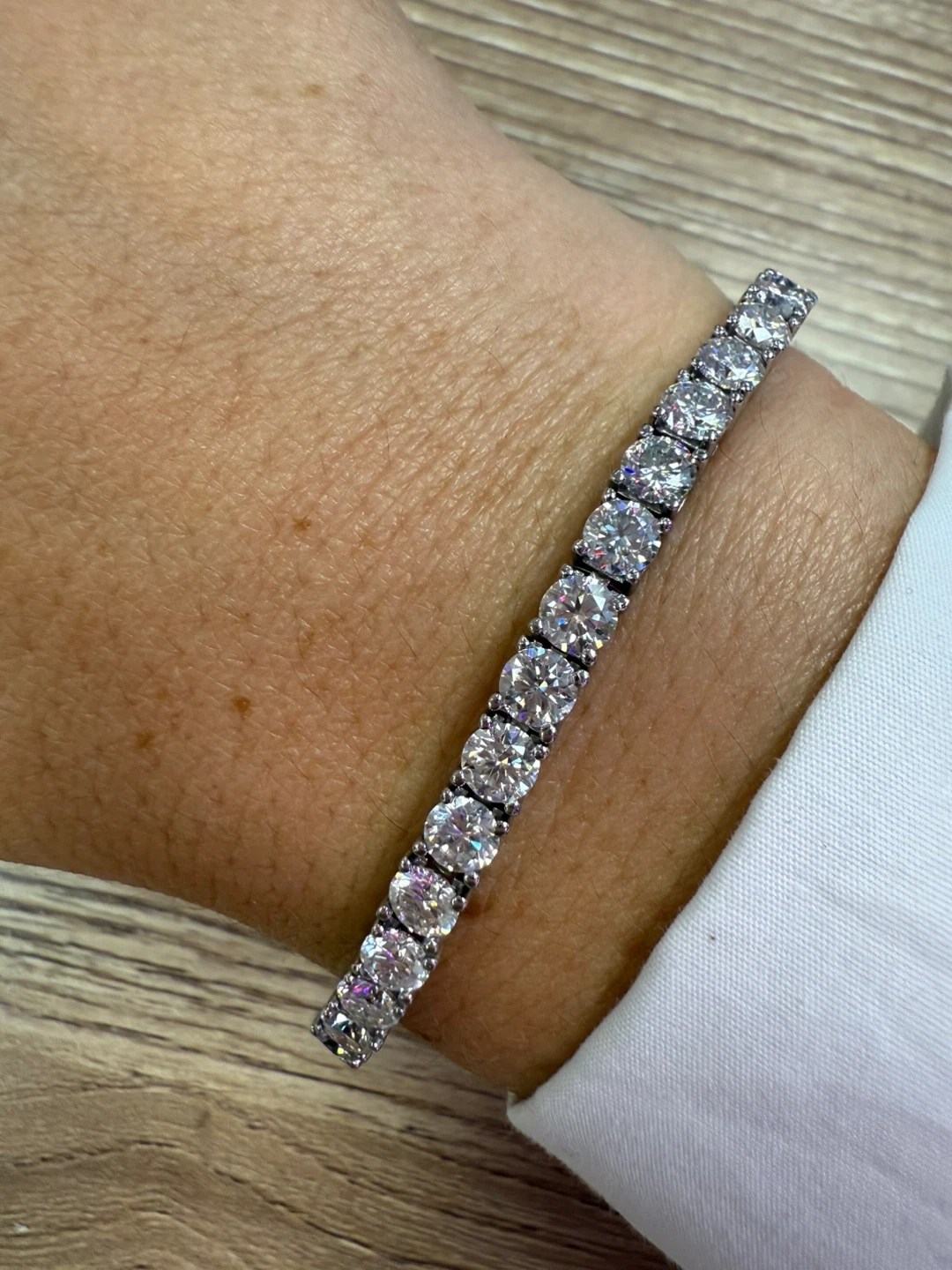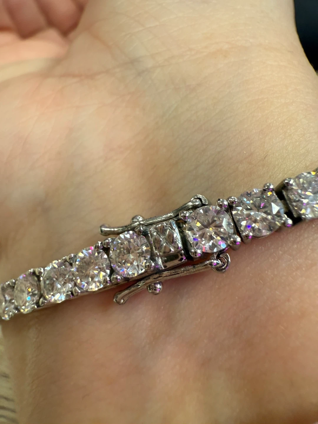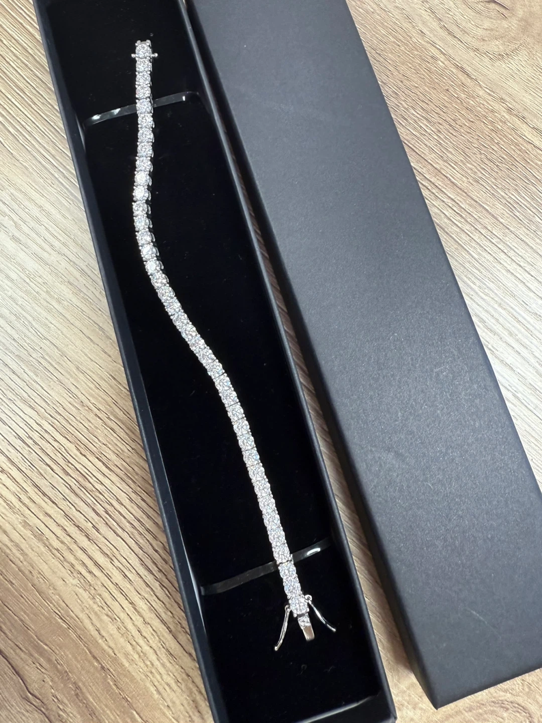 Selling a beautiful moissanite tennis bracelet. 17 cm long. It comes with its original box. It's a classic and elegant piece that would look great for any occasion.