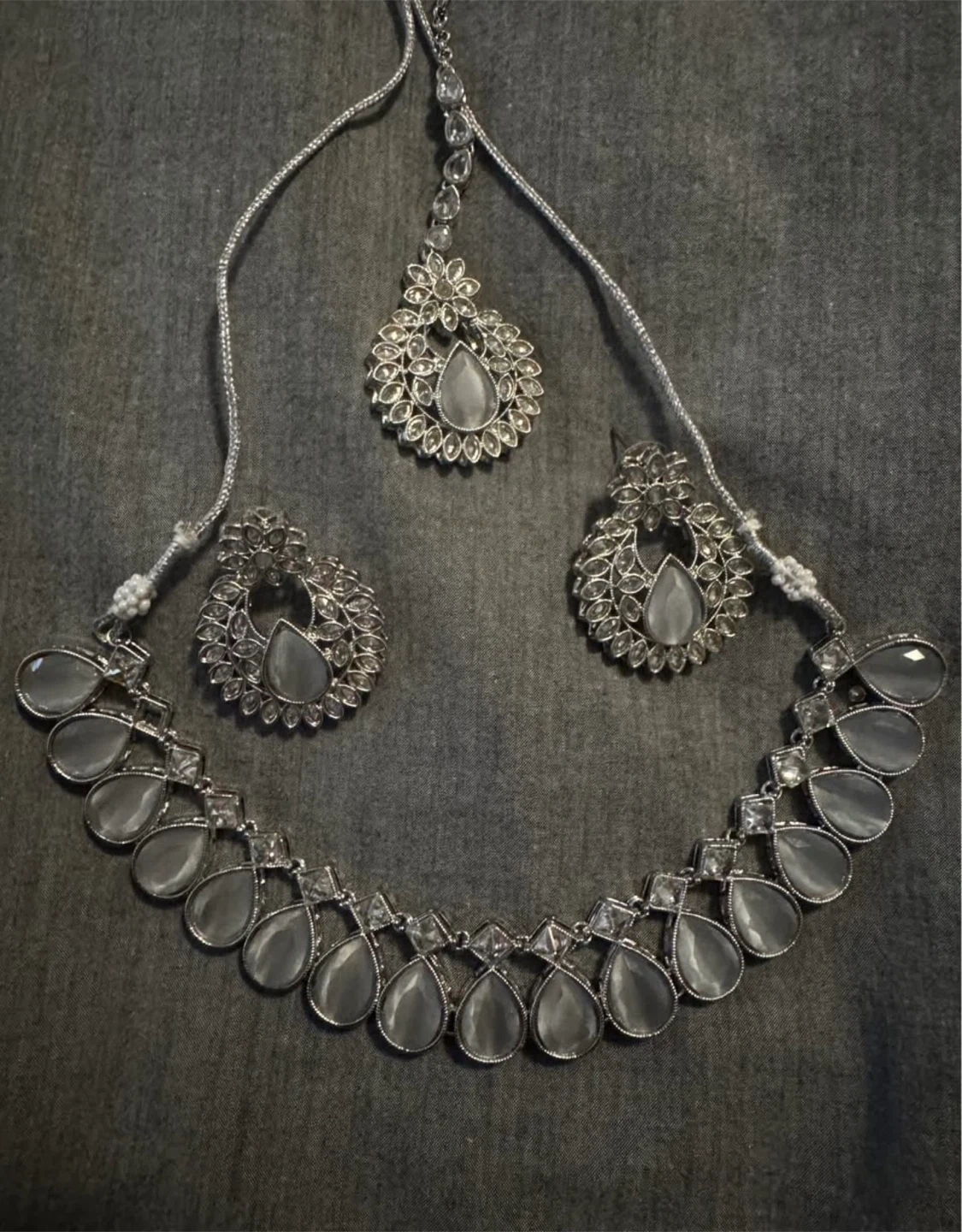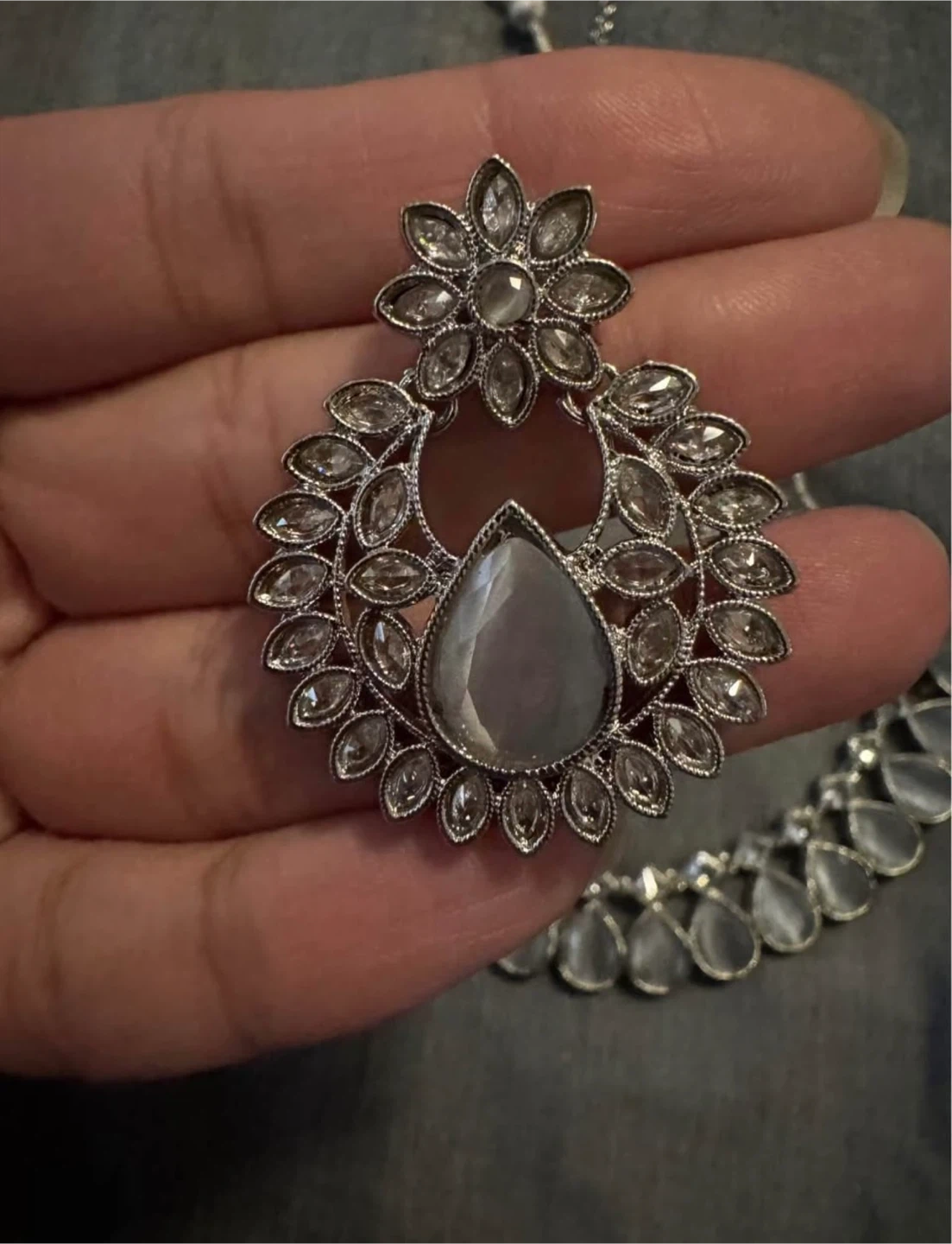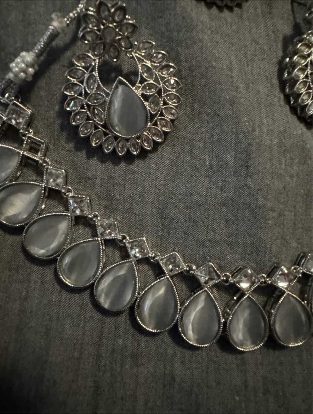 Selling a beautiful silver-toned necklace, earrings, and tikka set! The set features a lovely design with teardrop accents. Perfect for adding a touch of elegance to any outfit!