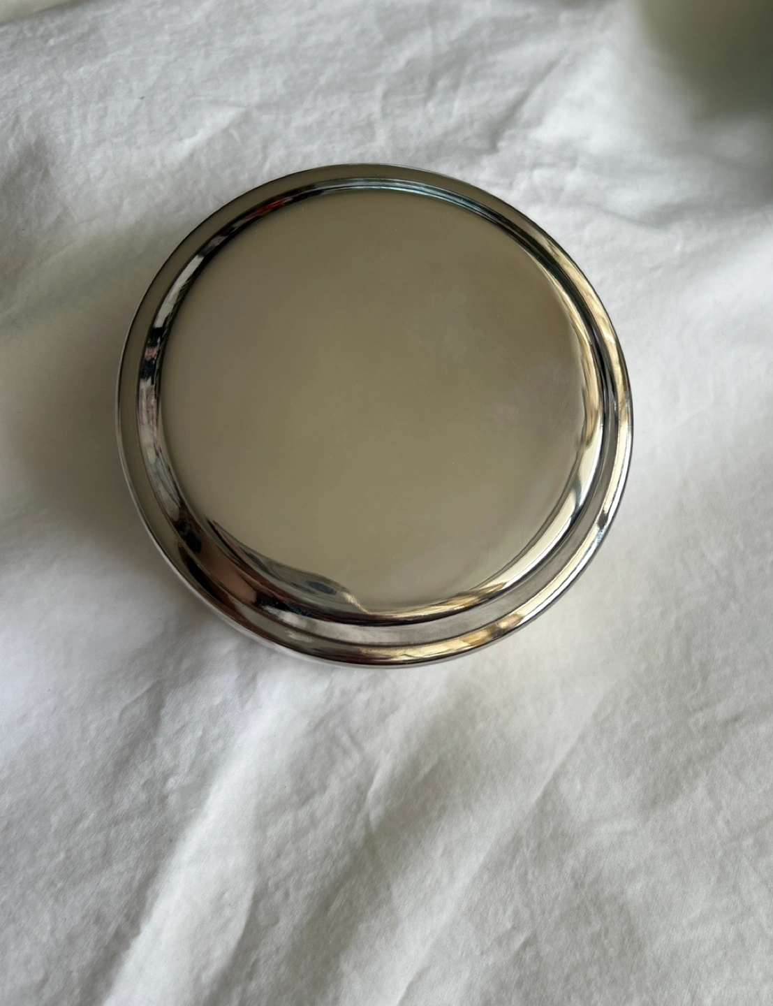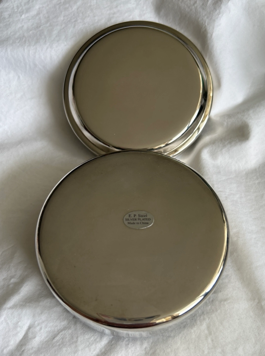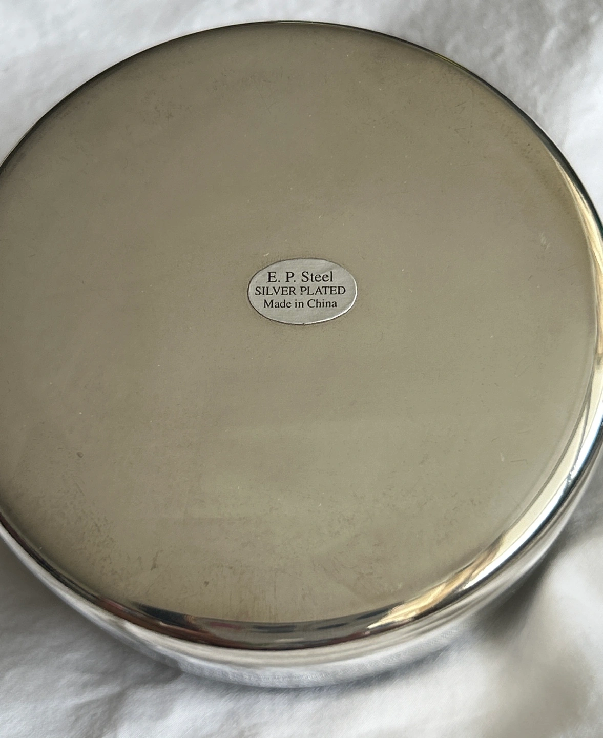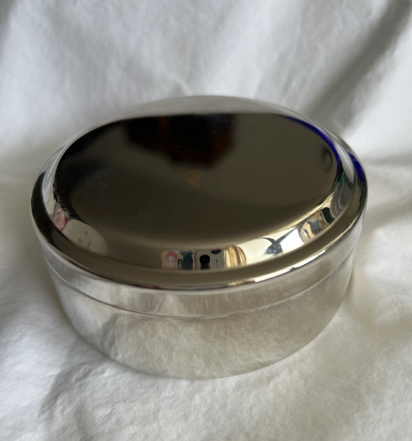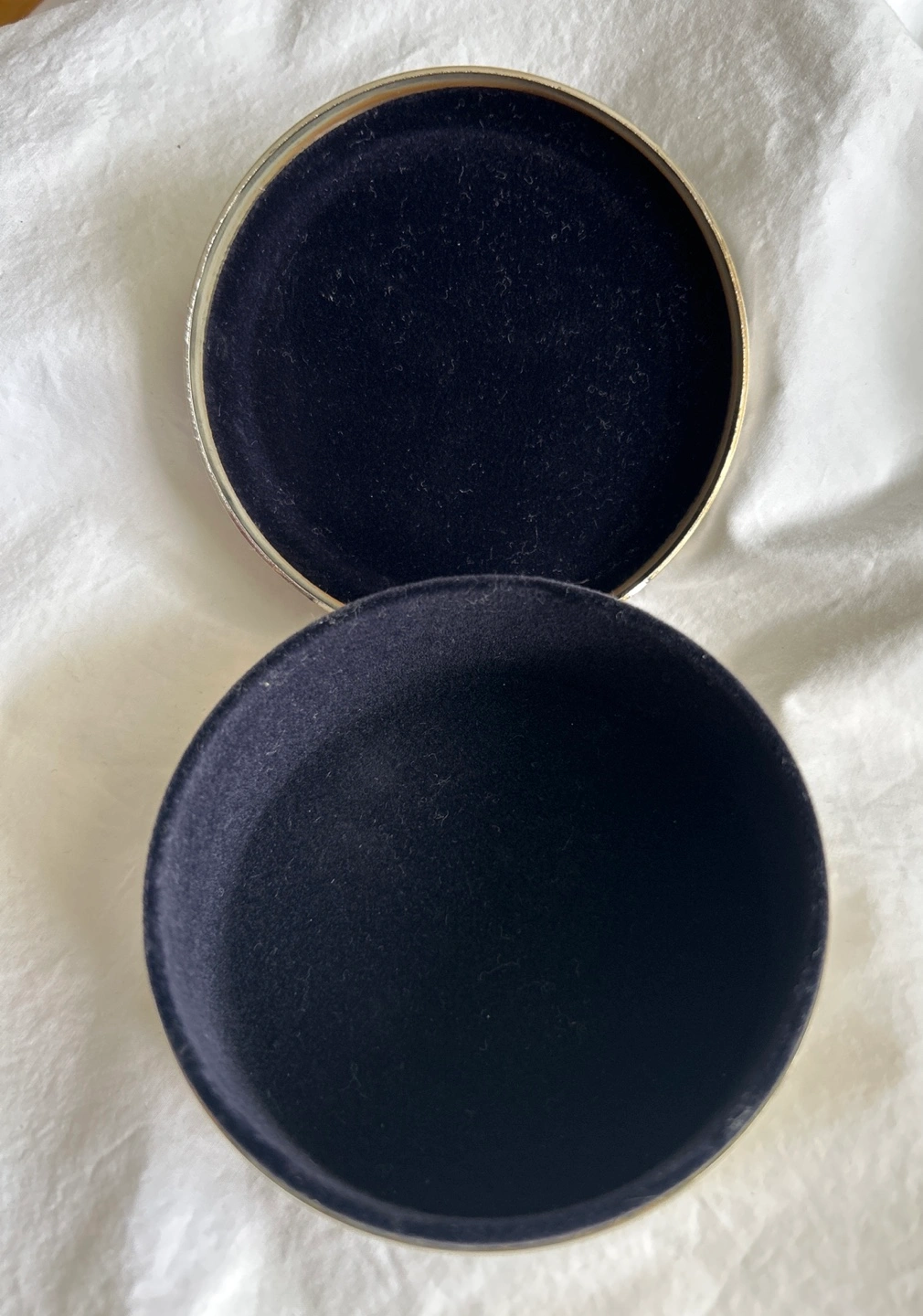 Small, round, silver-plated trinket box. Dark blue velvet interior. No scratches or dents. Check out the photos for details. Overall it is in very good condition. Smoke/Pet free home. Cash/Pick up only.