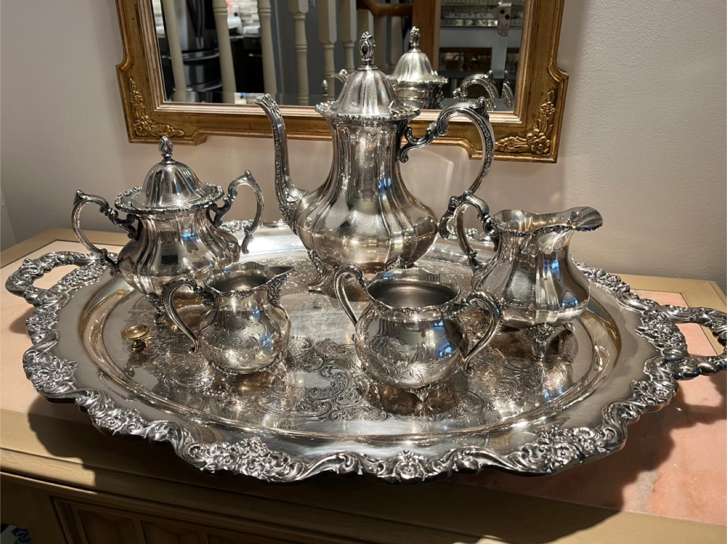 Selling a beautiful vintage silver tea set. Includes a teapot, sugar bowl, creamer, and a large serving tray. The set has a lovely ornate design. Perfect for afternoon tea or as a decorative piece!