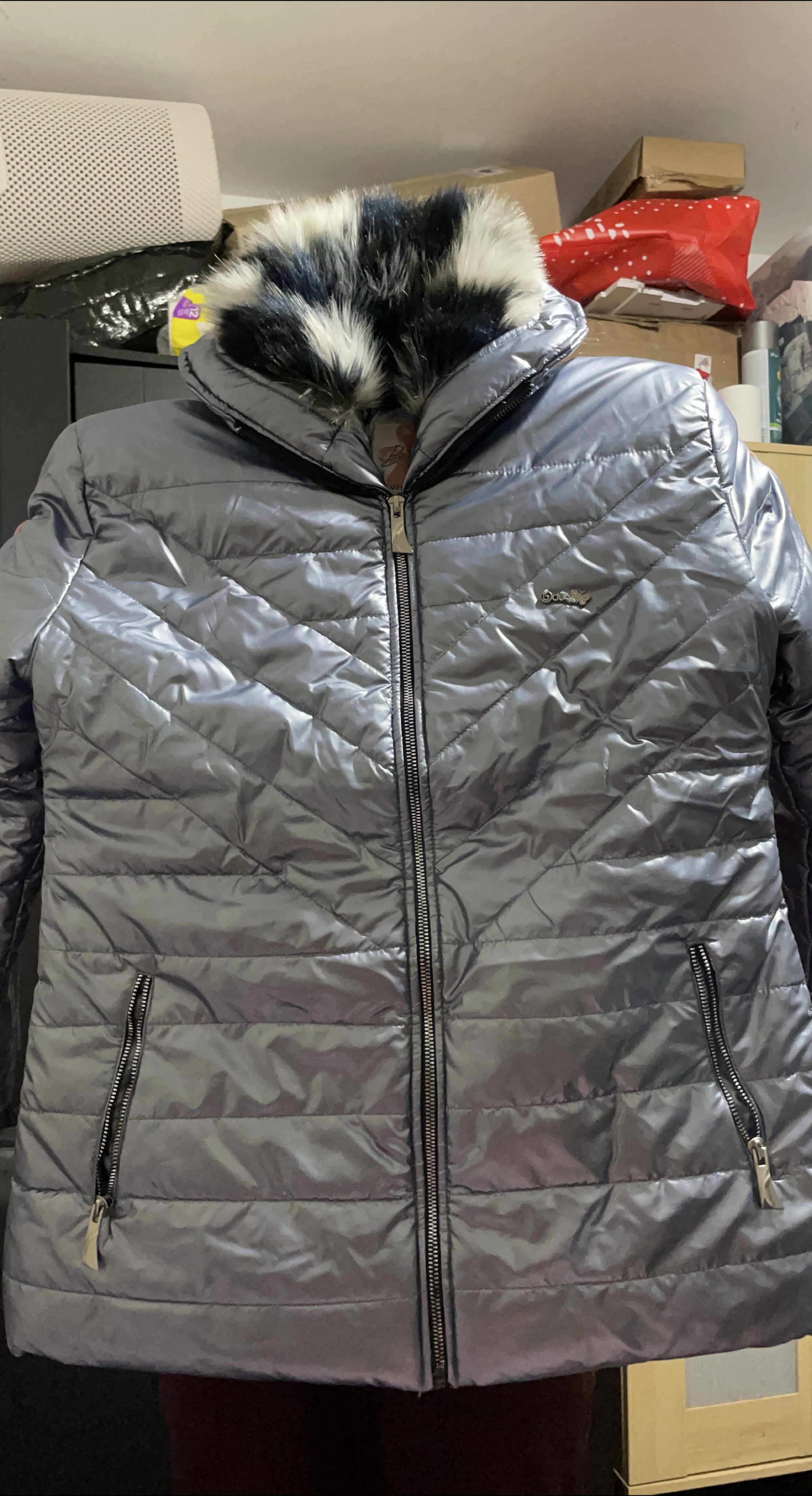 Here's a stylish silver puffer jacket that's perfect for staying warm and looking great! It features a faux fur hood for extra coziness and a unique touch. The quilted design adds a modern flair to the jacket. It's in great condition and ready for a new home