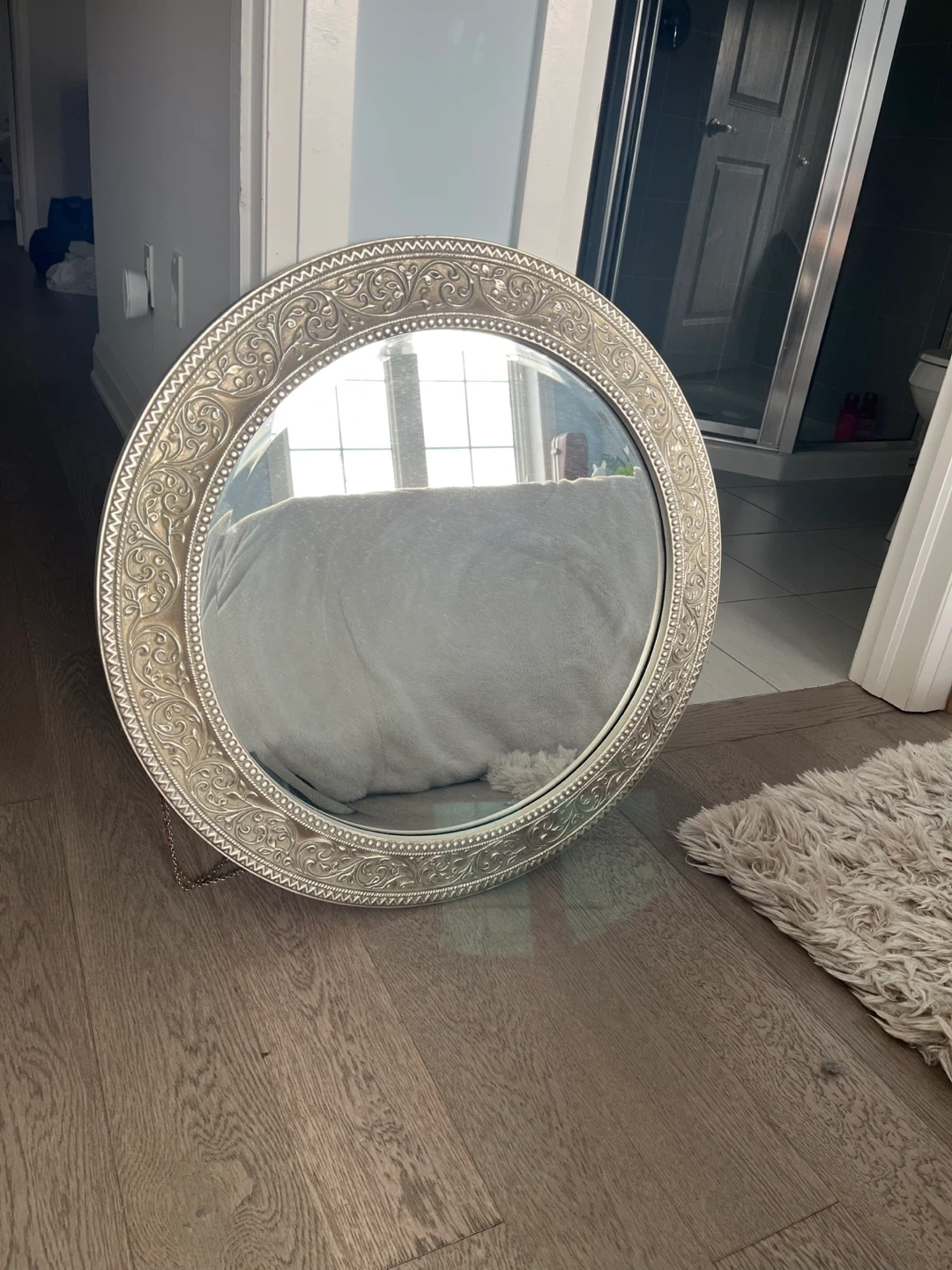 Selling a beautiful round mirror with a decorative silver frame. It's in great condition and would look lovely in any room of the house!