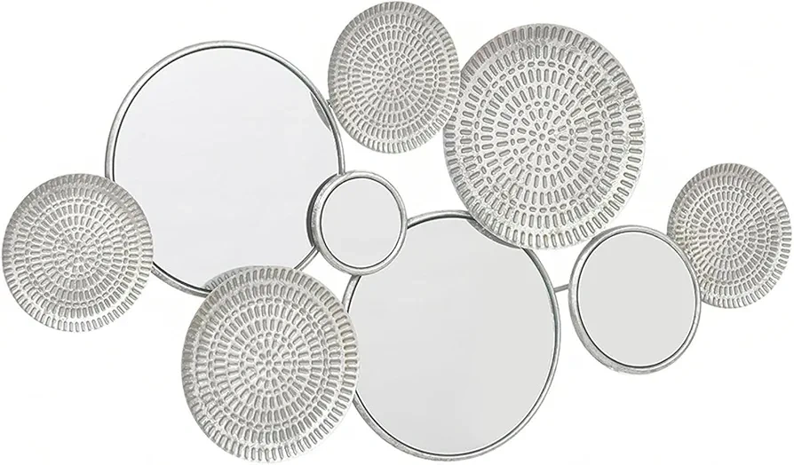 Add a touch of modern elegance to your home with this silver round mirror wall decor! The design features a series of interconnected circles, some with mirrored surfaces and others with a textured, decorative pattern. It's a stylish piece that would look great in any living room, bedroom, or hallway