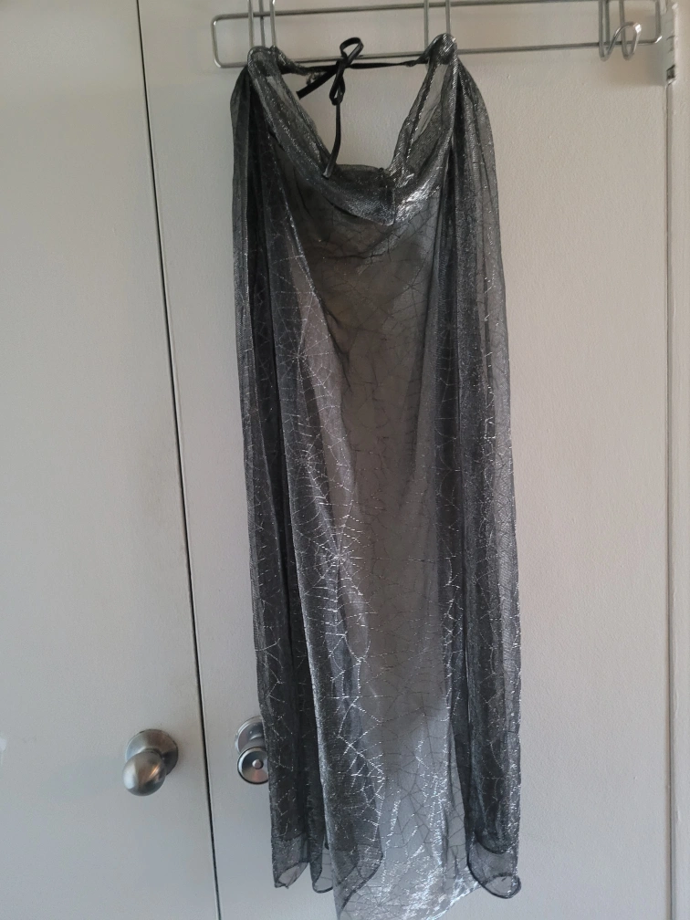 I'm giving a silver sheer cover-up! It's in great condition and would be perfect for layering or wearing as a beach cover-up. The material is lightweight and flowy, making it comfortable to wear. The silver colour adds a touch of sparkle to any outfit