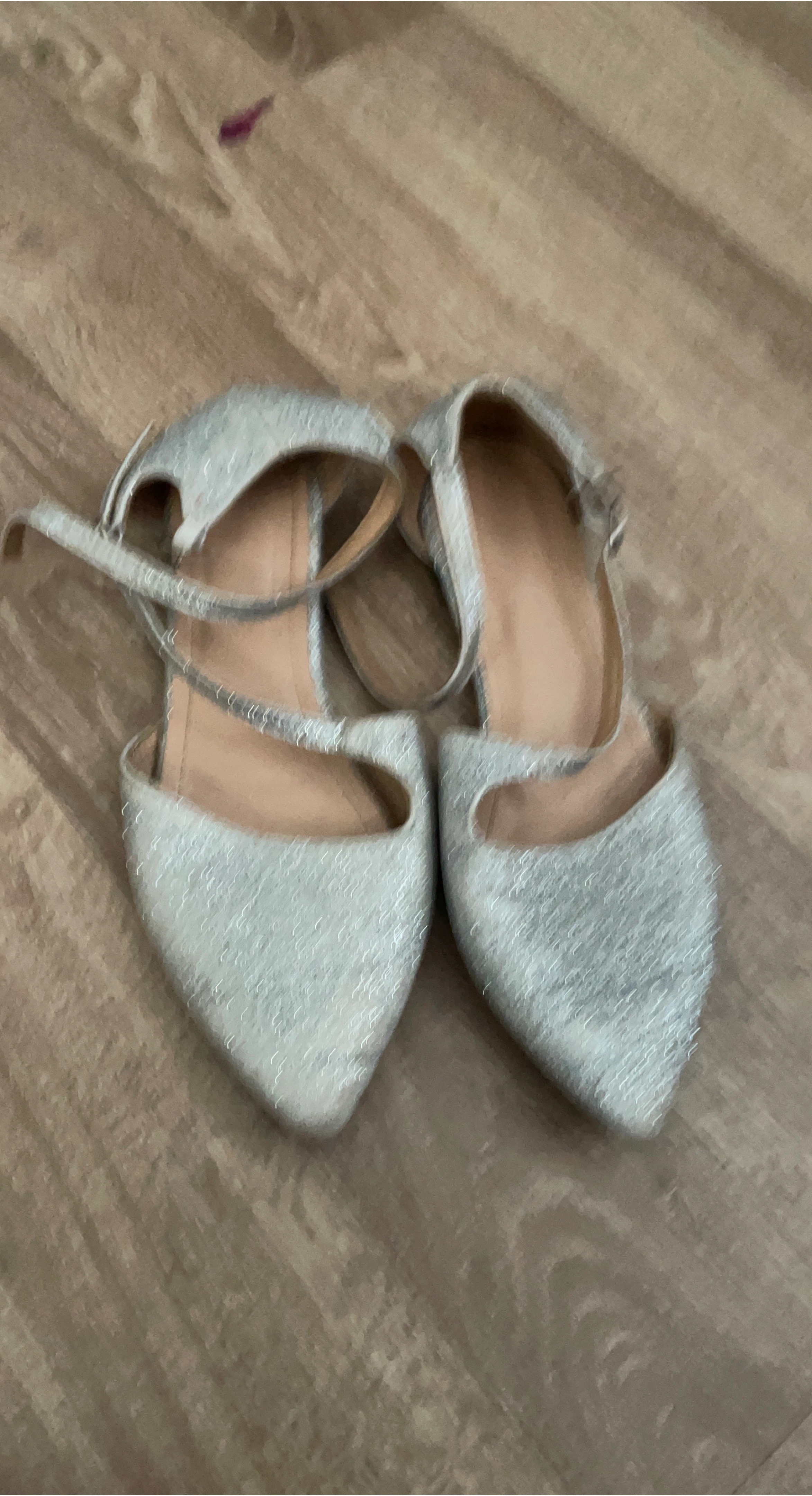 Selling a pair of sparkly silver flats. They have an ankle strap and a pointed toe. Perfect for a night out or a special occasion!