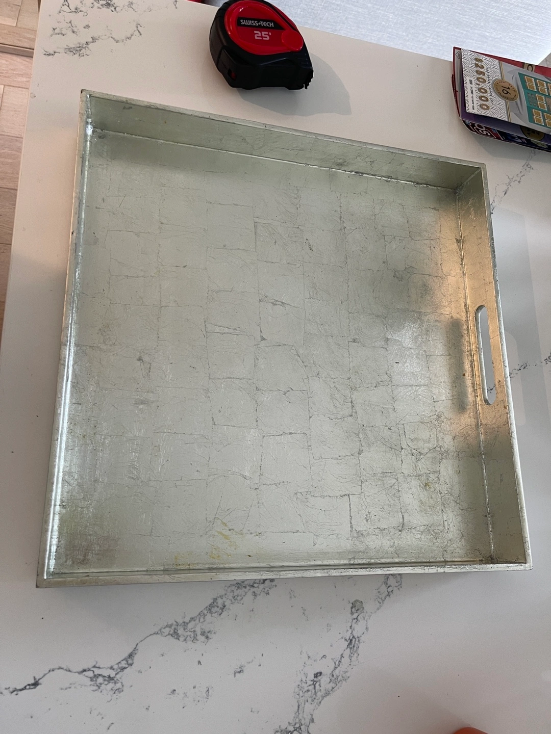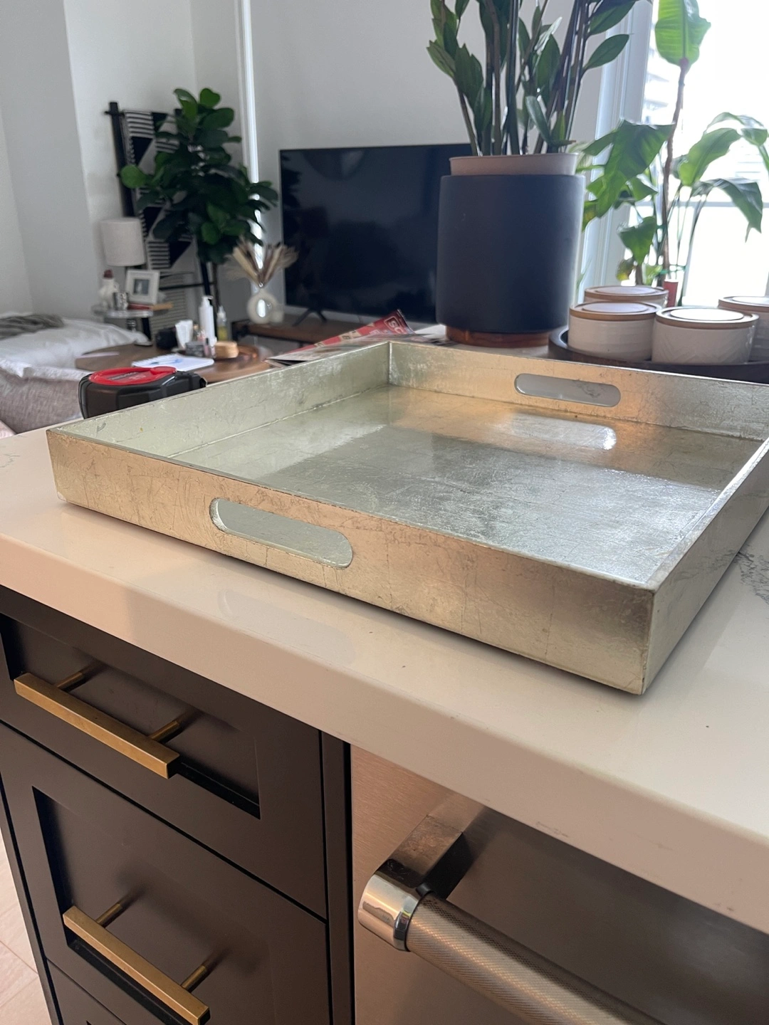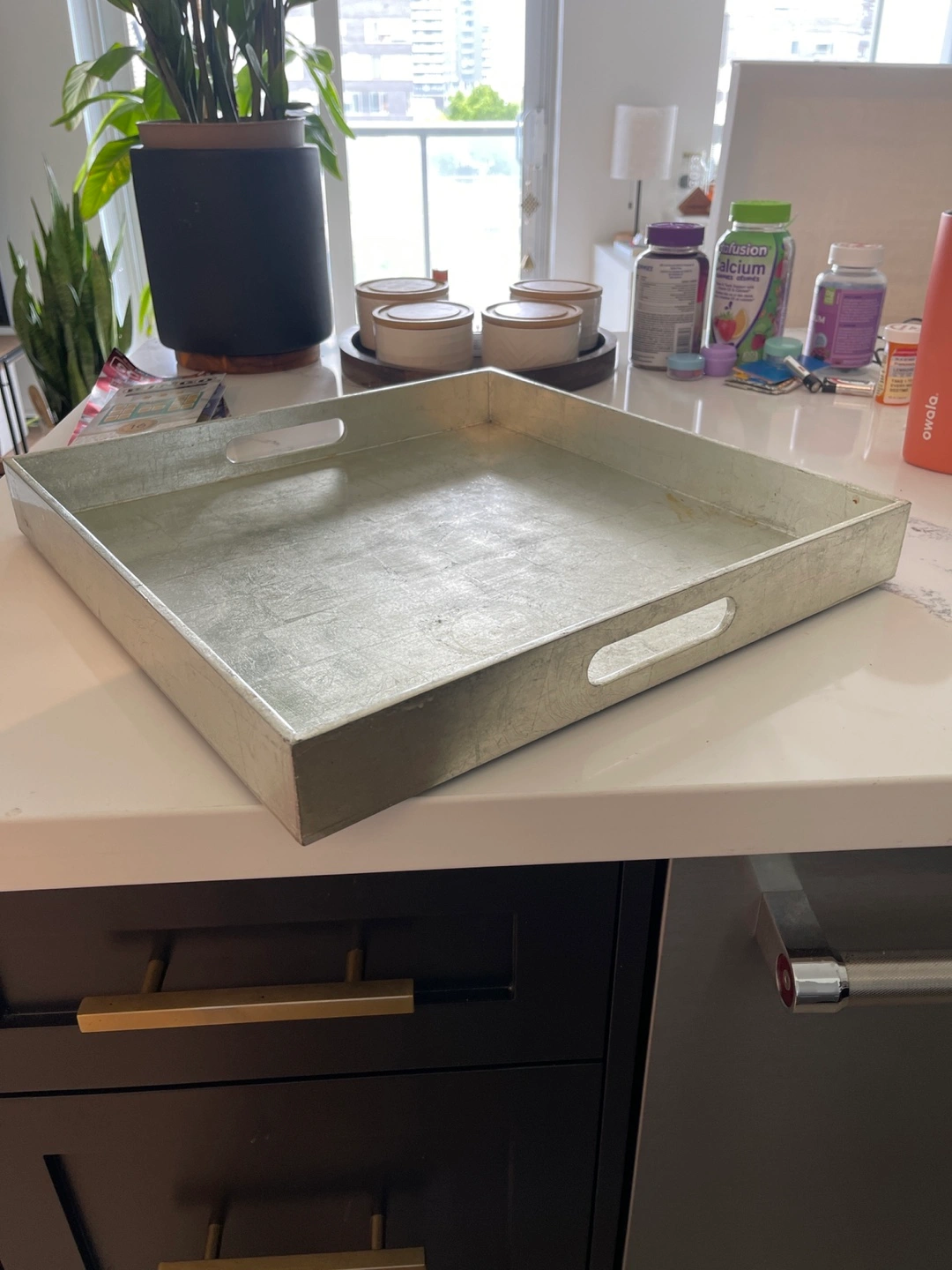 Silver-toned square tray. Features two cutout handles. Perfect for serving or organization. Great for coffee table, ottomans or bar cabinet counters