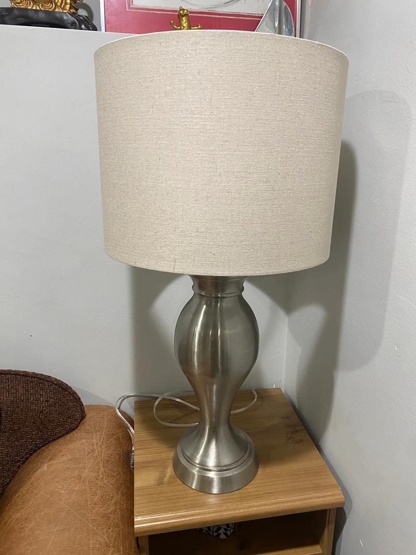 A silver table lamp with a white fabric shade. (Bulb not included)