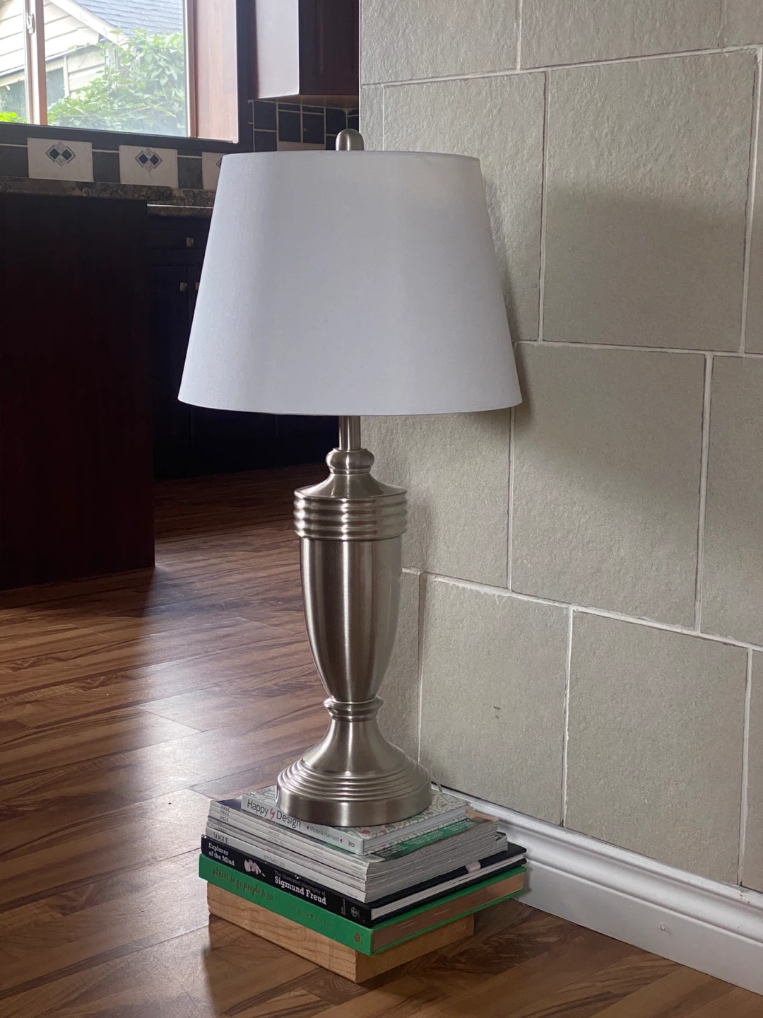 A lovely silver-coloured table lamp with a crisp white shade. It's in great shape and would look fantastic in any room. Perfect for adding a touch of elegance to your home!
