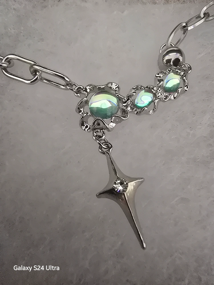 Selling a lovely silver-tone necklace! It features a mix of chain styles and a star pendant. The necklace has a few decorative stones and is in great condition. It adds a touch of sparkle to any outfit! Comes with silver polishing cloth and box.