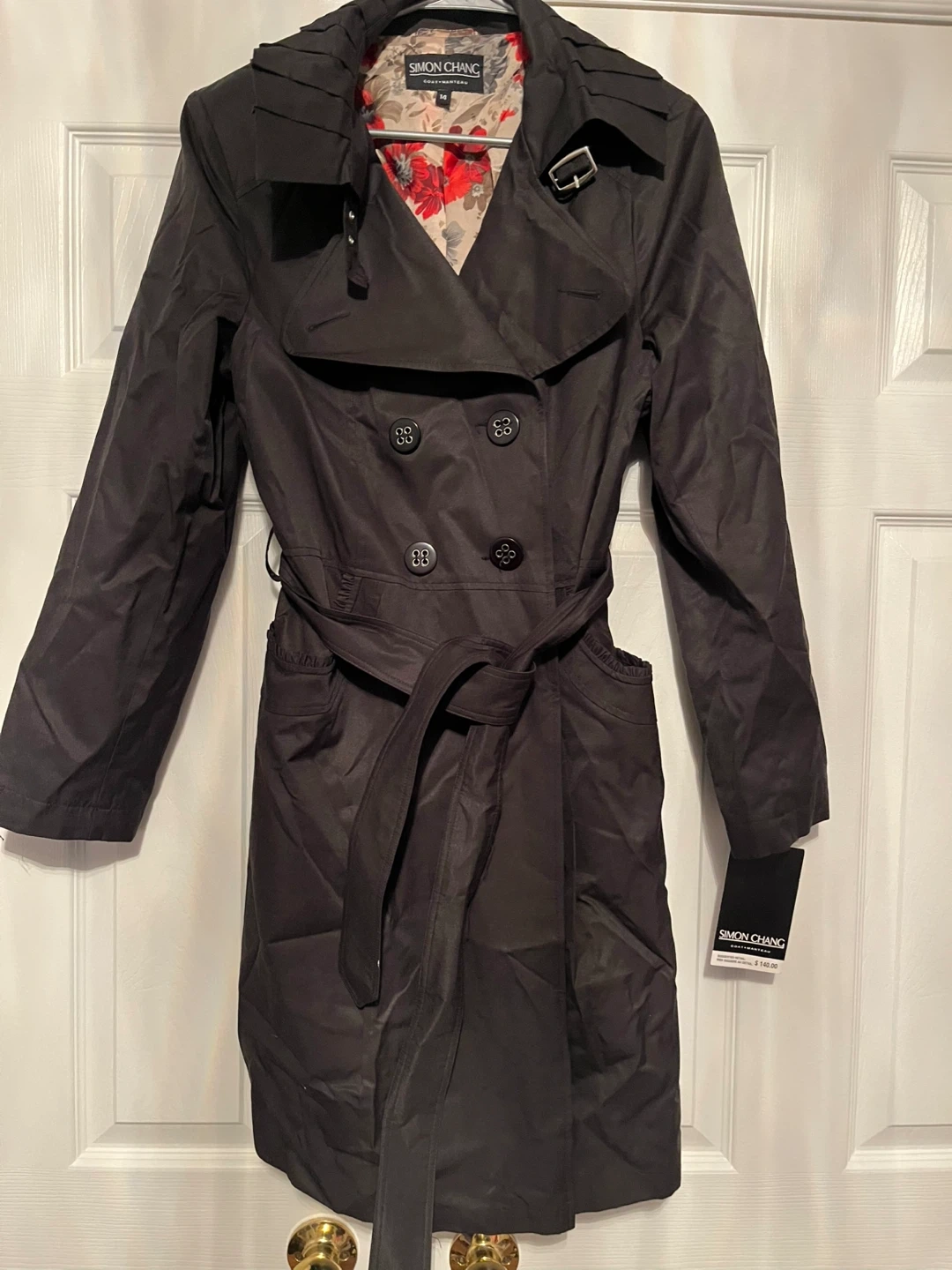 Selling a stylish Simon Chang trench coat in black. It's a size 14 and features a double-breasted design with a belted waist. The lining has a beautiful floral pattern. The tag shows it originally retailed for $140 Beautiful pleated collar gives this trench coat a stylish elegant look