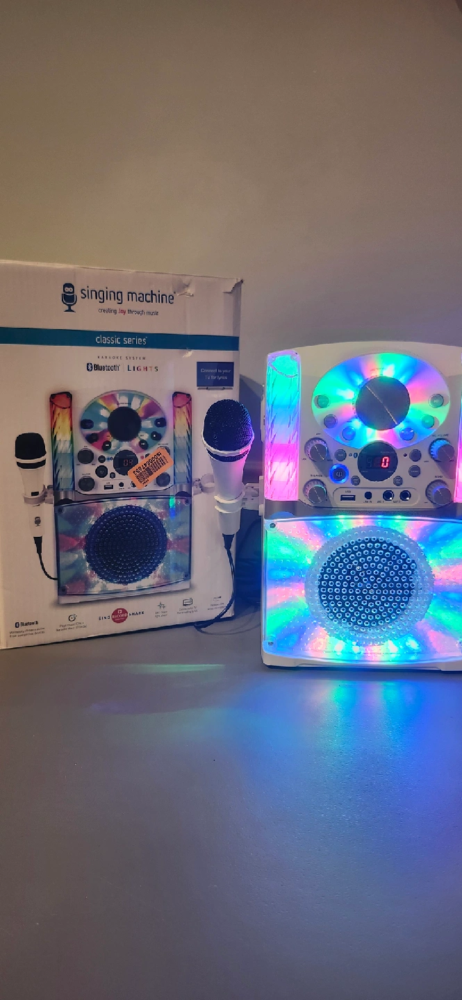Get ready to sing your heart out with this Singing Machine karaoke system! It features Bluetooth connectivity and fun lights to create a party atmosphere. Connects to your TV for lyrics! Comes with the box