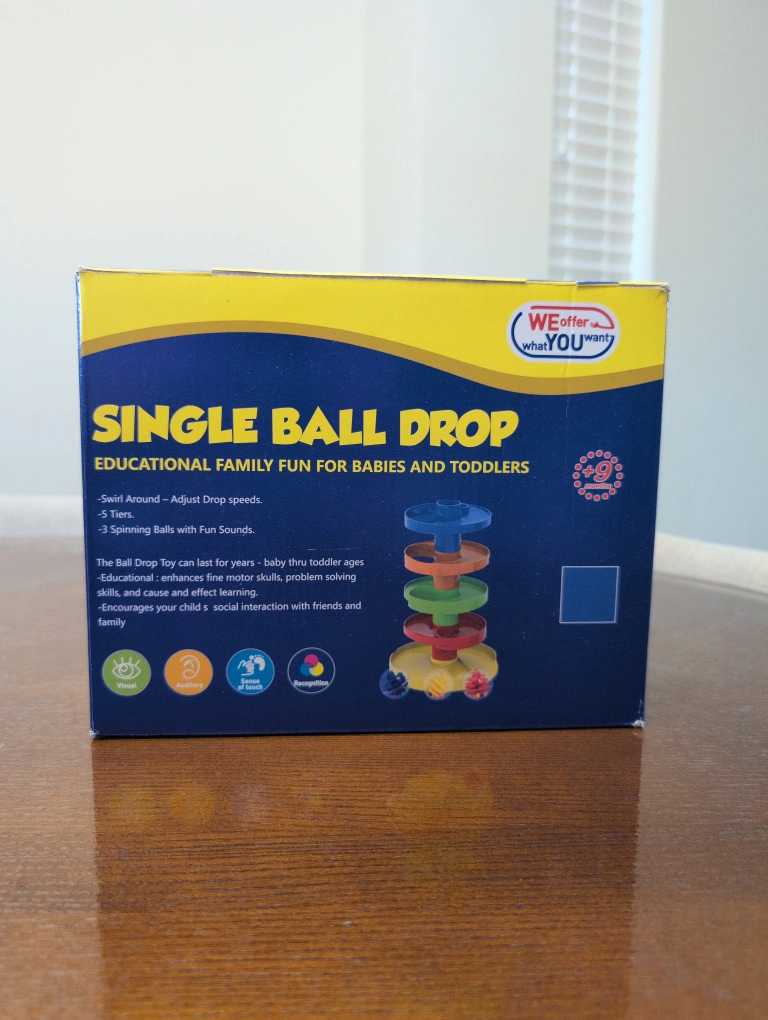 This Single Ball Drop toy is perfect for babies and toddlers! It provides educational family fun. It features: - Adjustable drop speeds - 5 tiers - 3 spinning balls with fun sounds It enhances fine motor skills, problem-solving skills, and cause-and-effect learning, encouraging your child's social interaction with friends and family