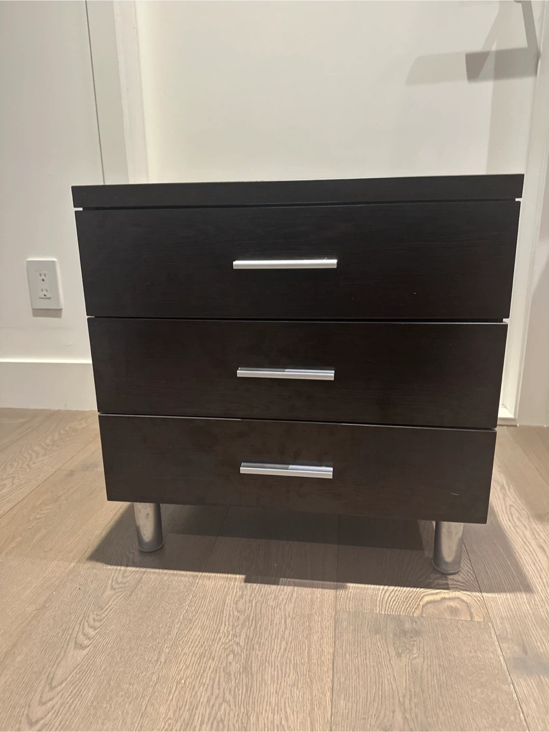 Single brown nightstand with three drawers! It's perfect for keeping your bedside essentials organized. The silver handles add a nice touch, and the piece is in great shape. It would look great in any bedroom!