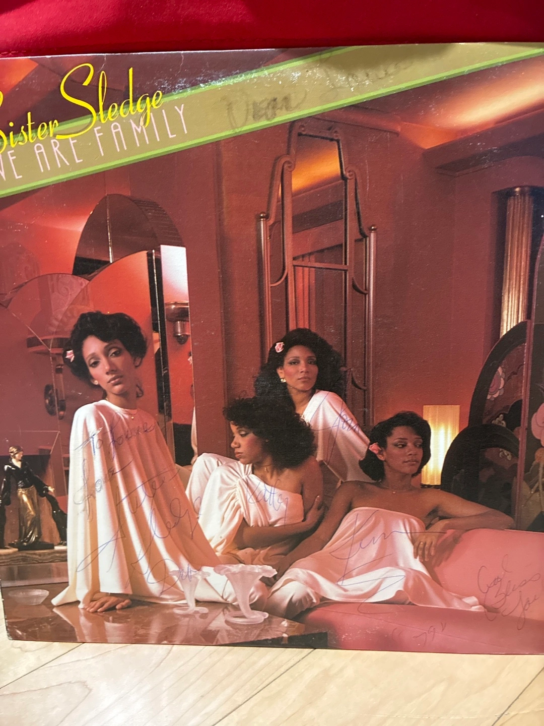 Selling a Sister Sledge "We Are Family" vinyl record. The cover is autographed! Regular wear & tear on album cover but the record is near mint!!