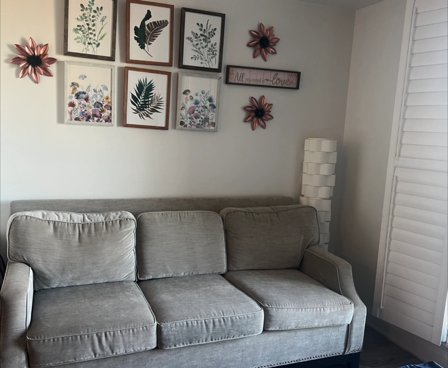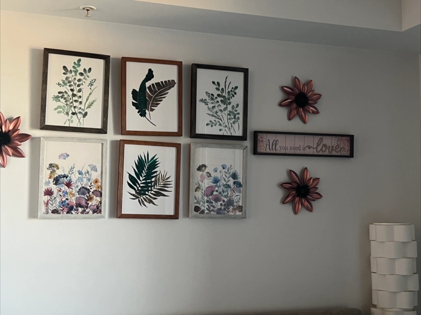 Set of six framed botanical prints. Various leaf and flower designs. Neutral colours. Wooden frames. Great for adding a touch of nature to your home decor. Also included: 'All you need is love' sign and three rose-gold decorative flowers.