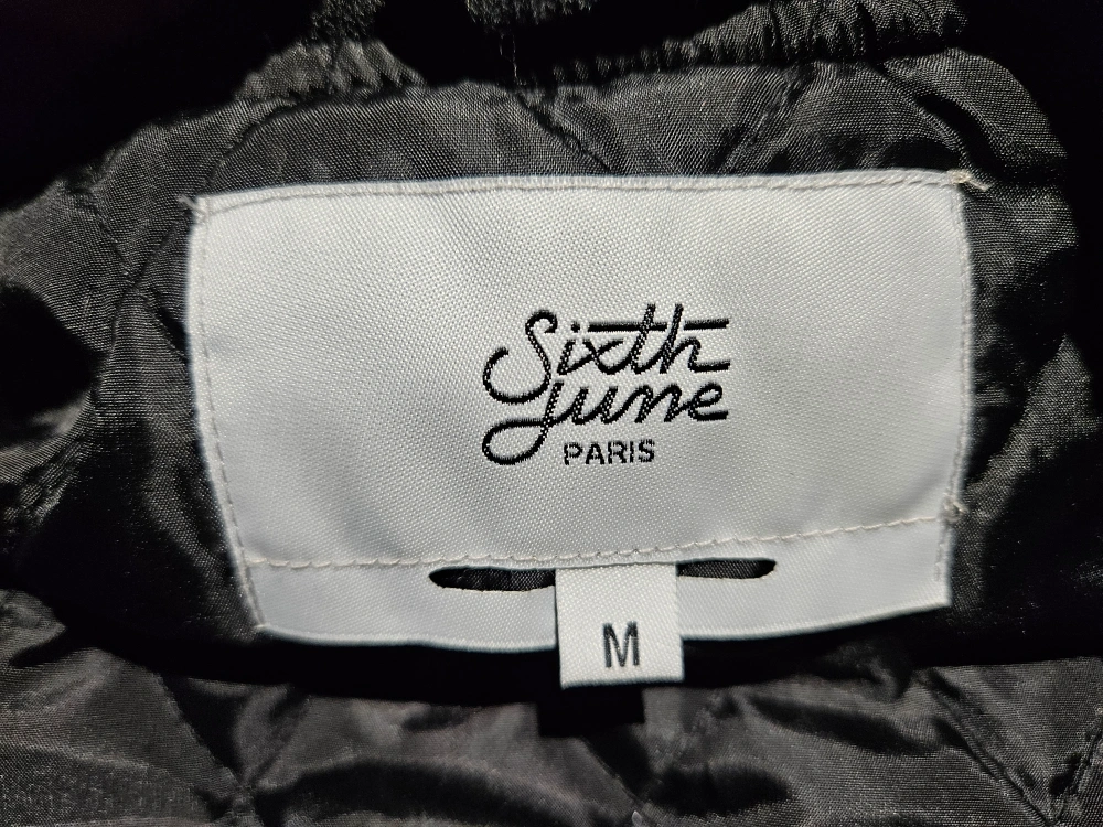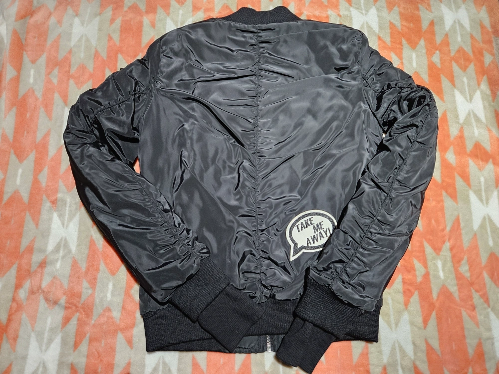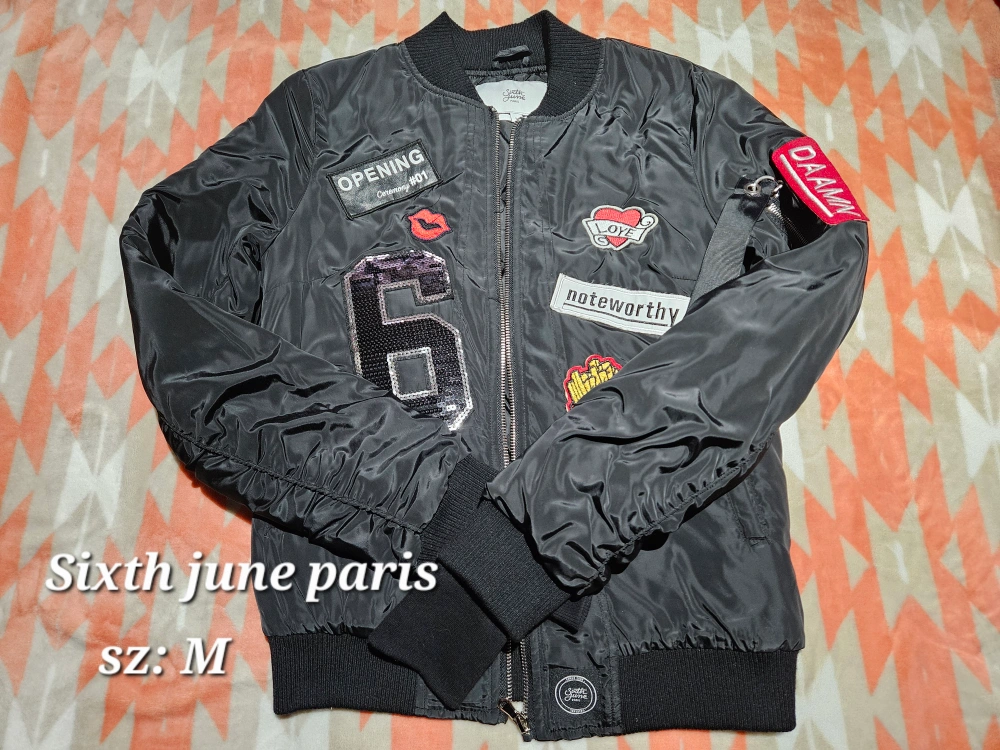 Selling a stylish Sixth June Paris bomber jacket in black. It's a size medium and features unique patches and details. Perfect for adding a bit of edge to your outfit!