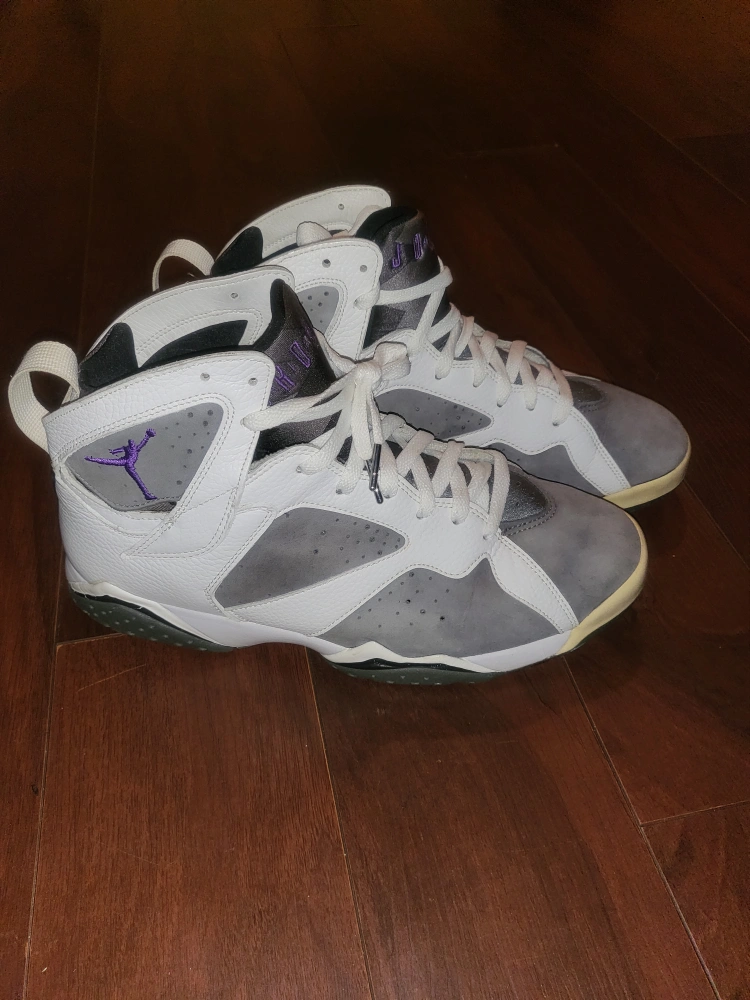 Selling a pair of Air Jordan 7 Retro “Flint”. sneakers in size 10.5 US. They show some signs of wear, but still have plenty of life left. The colourway features white, grey, and purple accents. Great for everyday wear or adding to your collection! model was officially released on April 22, 2006.