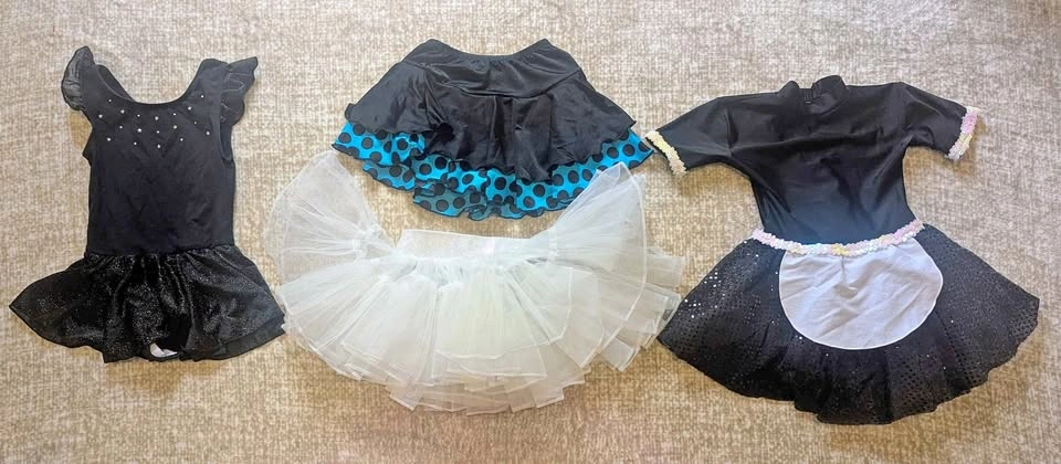 Bundle of size 6 costumes — perfect for dance, dress-up, or Halloween: 🖤 Black bodysuit dress (George, Walmart brand, sparkle detail with flutter sleeves) 🖤 Black & white dance costume (French maid style, sequin trim) 💙 Black/blue polka-dot dance skirt 🤍 White crinoline/tutu (great layering piece) All in good condition — most are proper dance-quality costumes. $15 for the lot 📍 Pickup in Burlington — cross-posted ✨ Or bundle with my pink/purple tutu for $20 total!