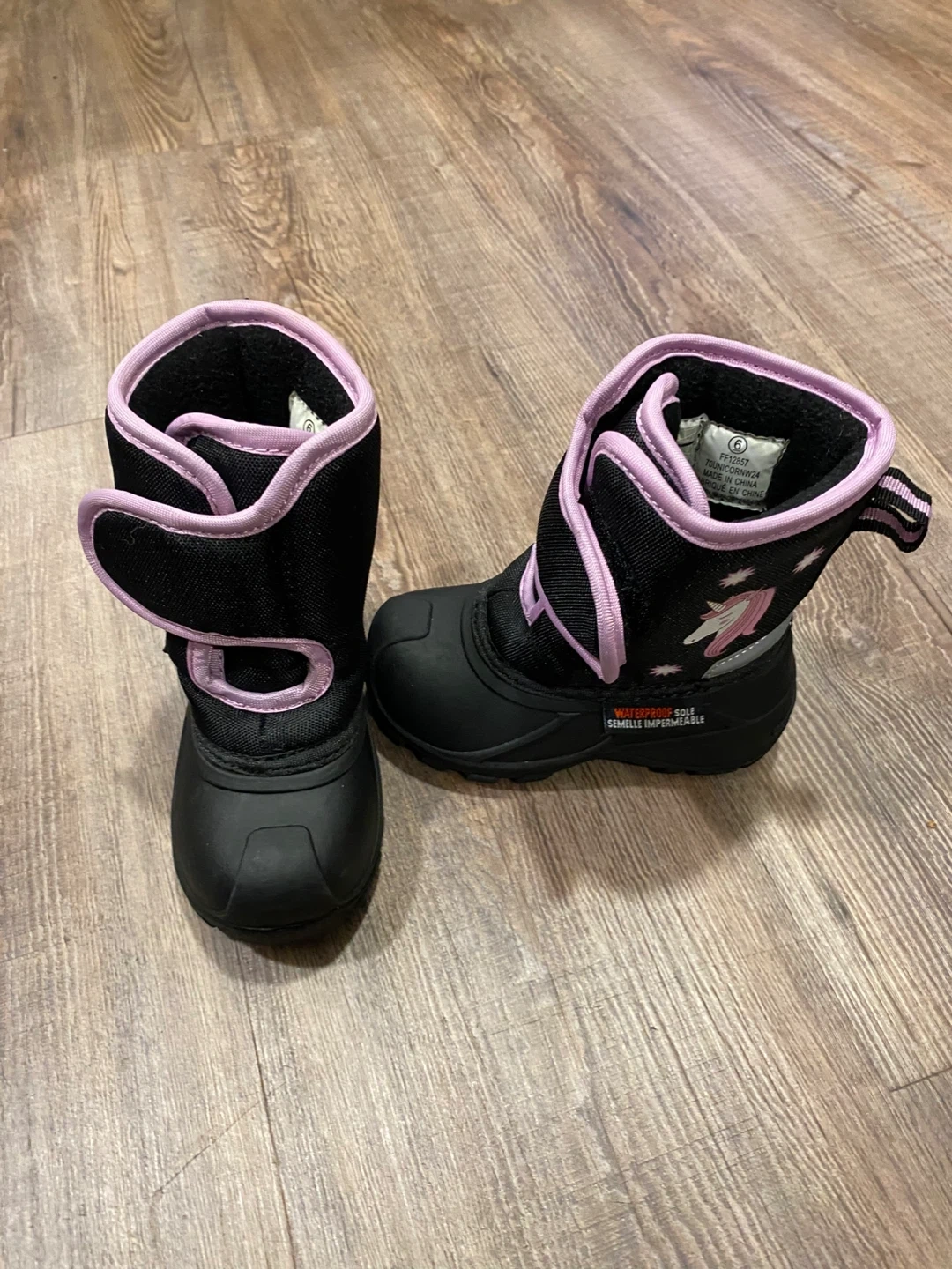 These adorable winter boots are perfect for keeping your little one's feet warm and dry! They feature a cute unicorn design and are waterproof for those snowy days. The boots are in great condition and ready for a new home. Size 6.