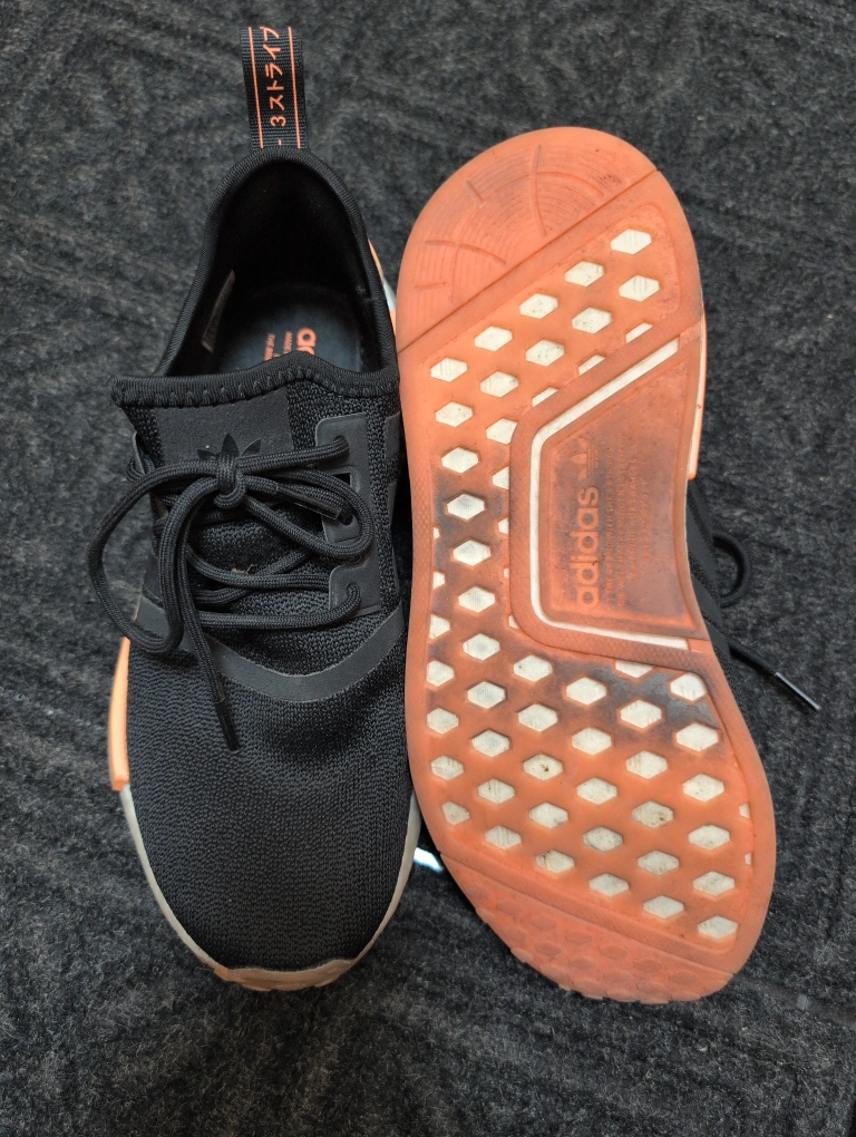 Selling a pair of Adidas NMD R1 runners in black with salmon accents. These shoes are in used condition, with some wear on the soles, but still have lots of life left. A great choice for everyday wear!