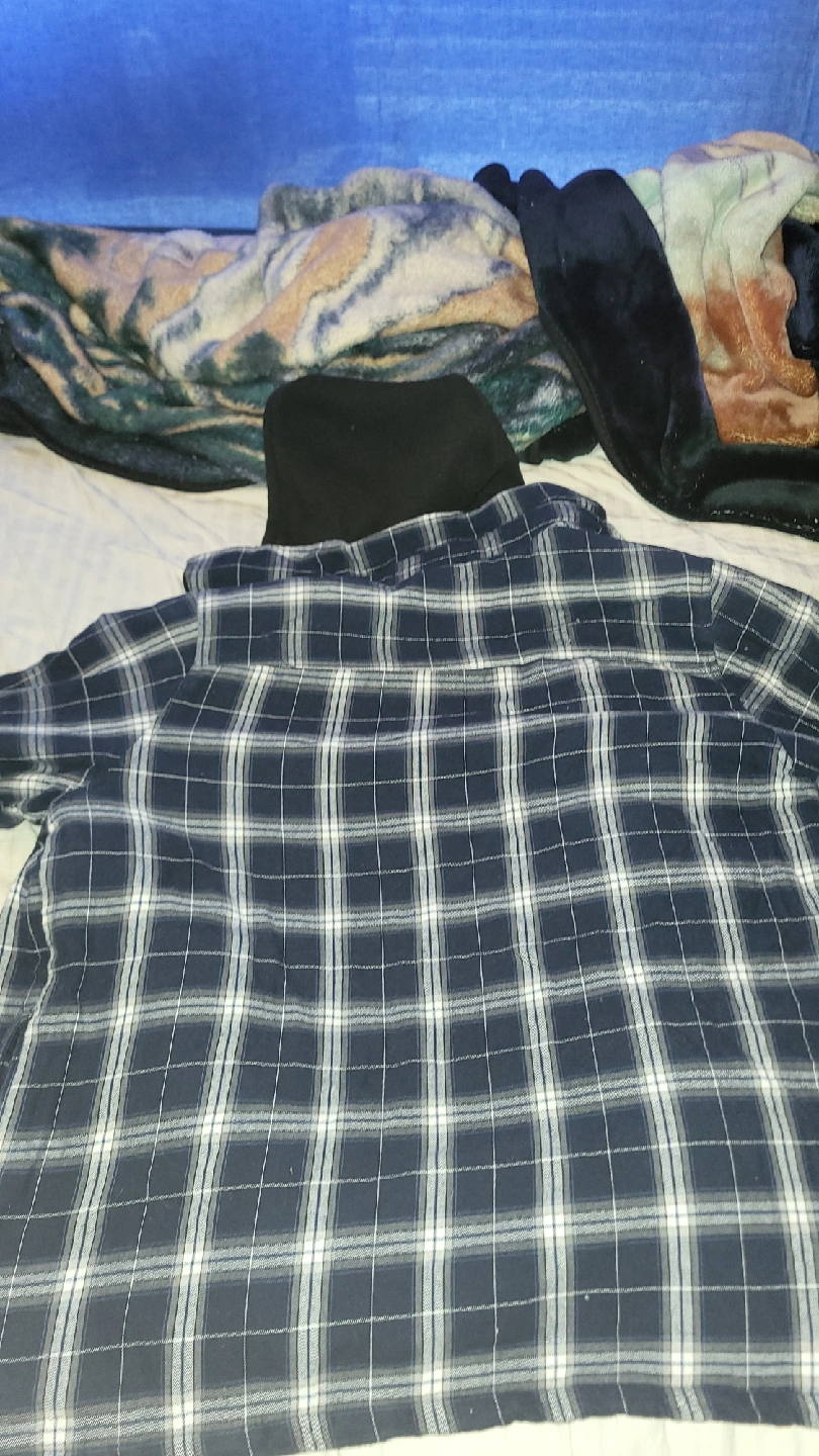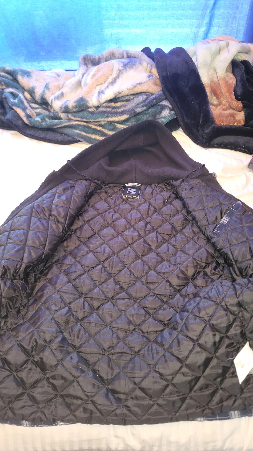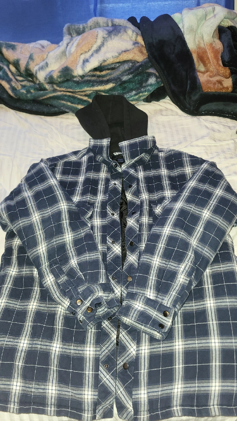 Blue plaid hooded shirt jacket. It has a black quilted lining and a hood. only worn once, feels great, lining surprisingly warm for not being very heavy