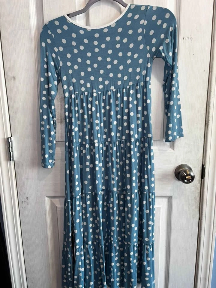 Made from ultra-soft 95% bamboo viscose & 5% spandex Size M / 8-10 years โ fits true to size Brand new with tags! Gorgeous tiered design with white polka dots on blue Retails for around $48 USD / $65 CAD โ Asking only $20! Pickup in Mission BC