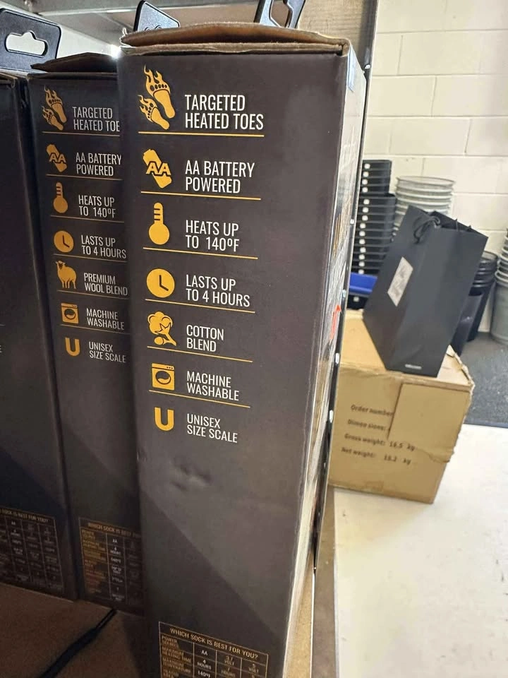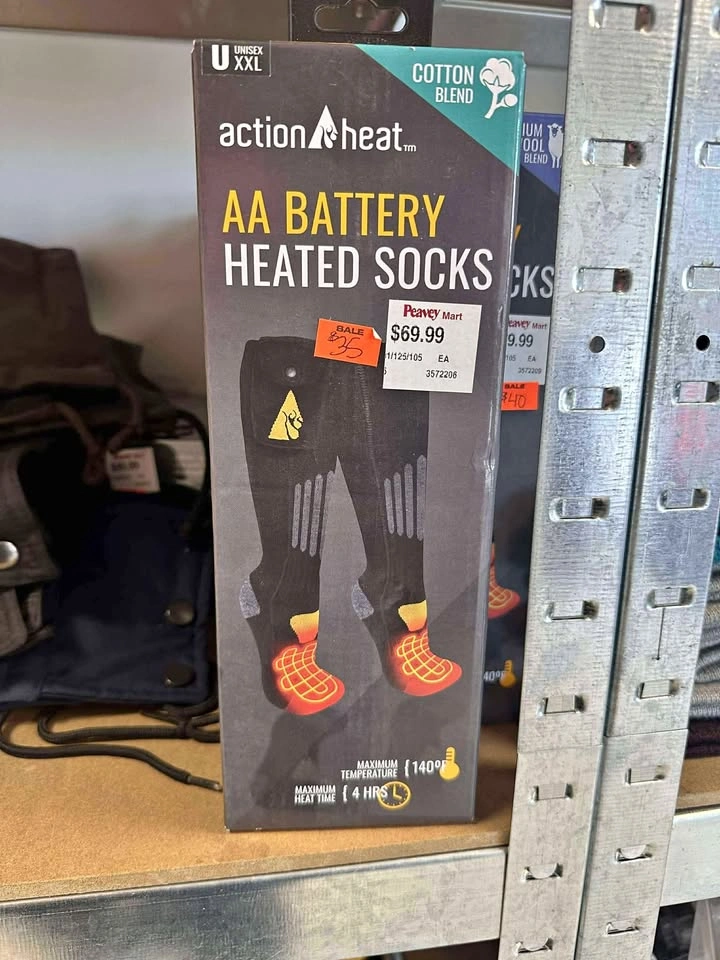 Size XXL. Heated socks run on AA batteries. Cotton blend. Name brand Action Heat. New still in box. $35 per pair plus HST. Pick up near Conestoga Mall in Waterloo, Monday to Friday from 12-5.