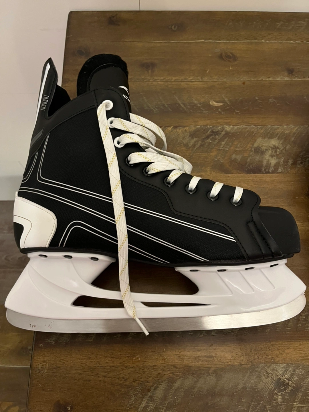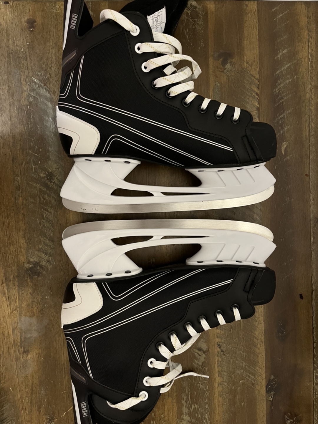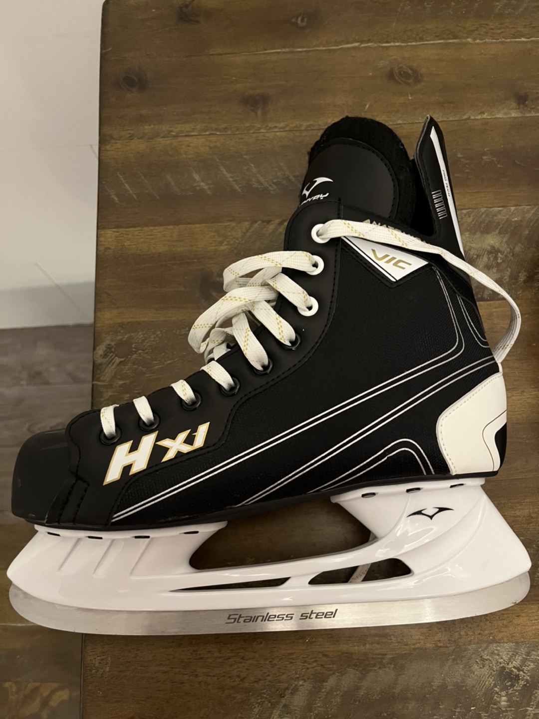 This is the hockey skates (size 10 for men's size). I've just bought it this Feb and I only used it 5 times, so there's no need to sharpen it. The maker is "VIC HOCKEY". And I have a original box of it, so it is easy to carry it.