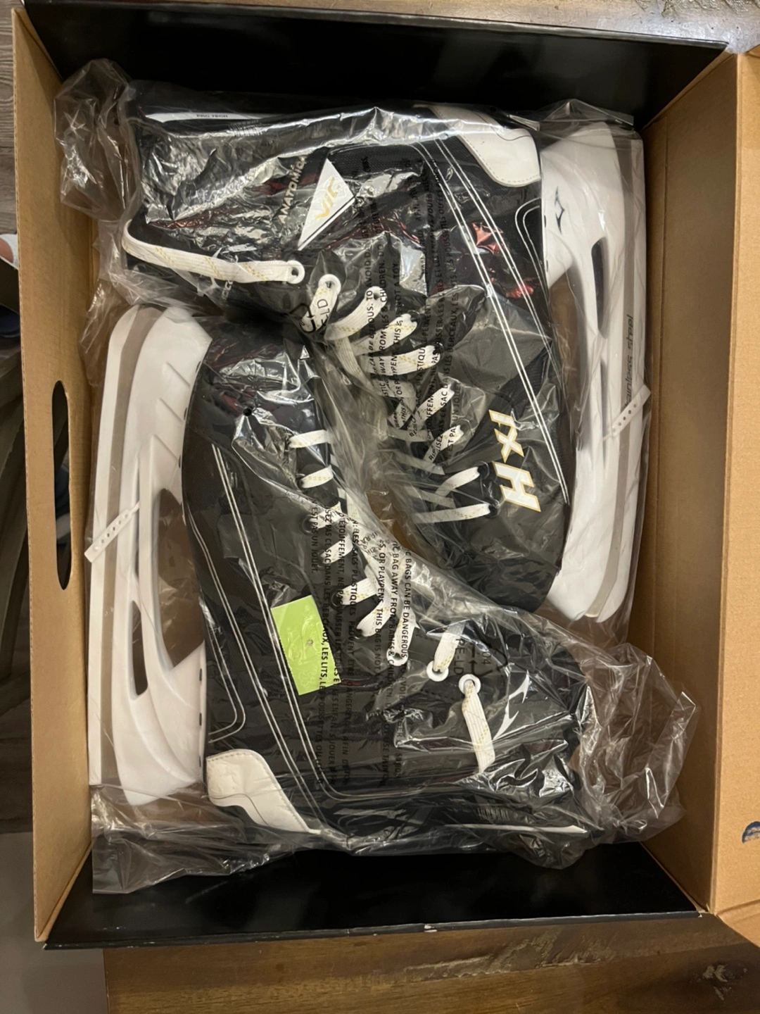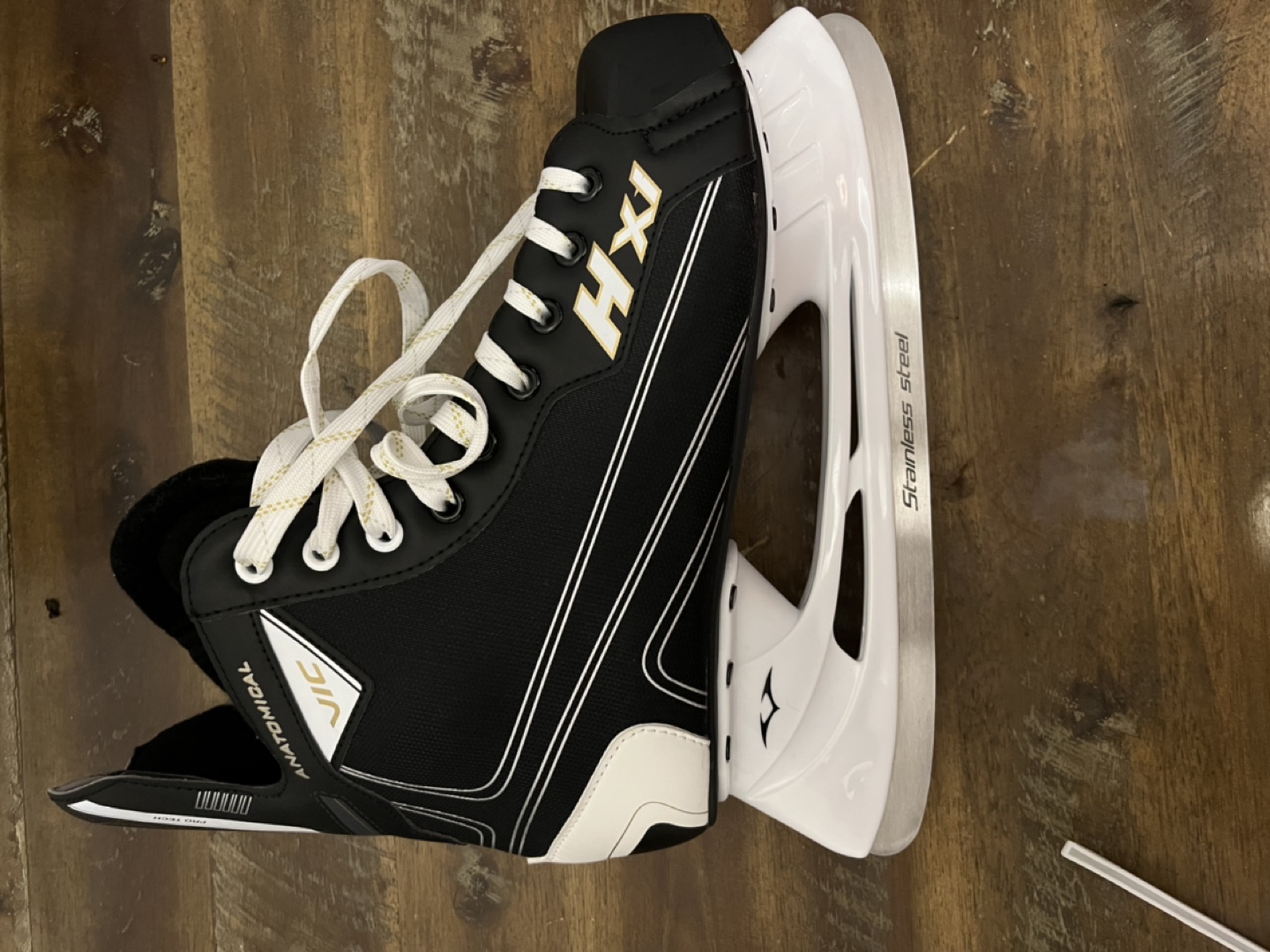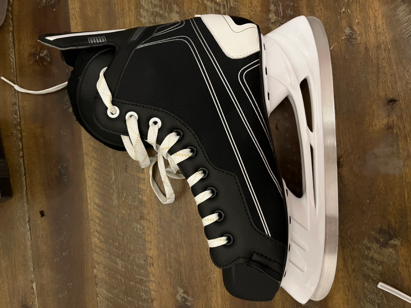 This is the hockey skates (size 10 for men's size). I've just bought it this Feb and I only used it 5 times, so there's no need to sharpen it. The maker is "VIC HOCKEY". And I have a original box of it, so it is easy to carry it.