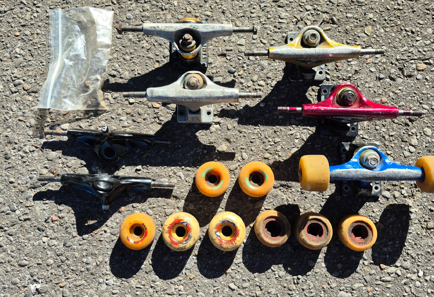 Selling a lot of used skateboard trucks and wheels. There are several different brands and colors of trucks. Also included are a variety of wheels in different conditions, as well as a bag of hardware. Great for someone looking to build or upgrade their skateboard!
