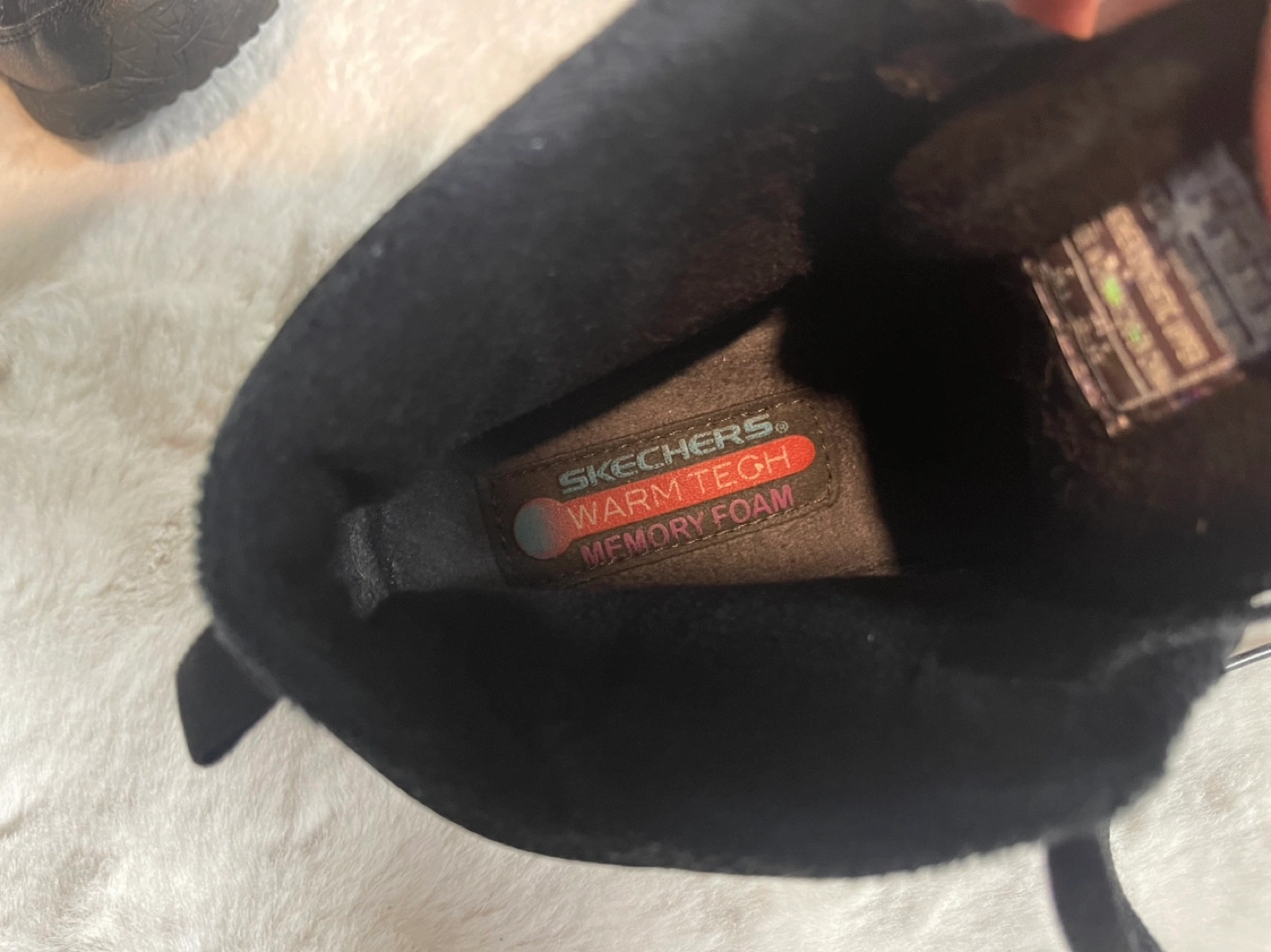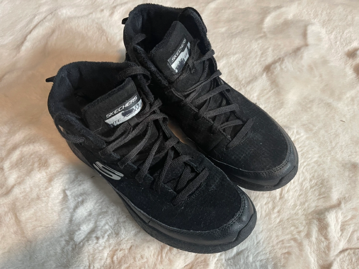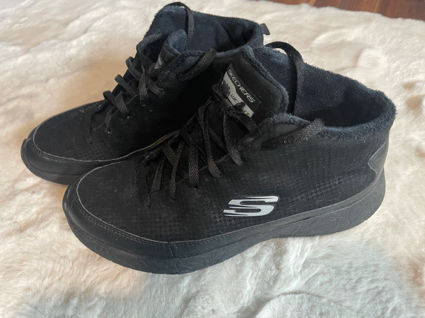 Black high top running shoes. Skechers logo and Warm Tech Memory Foam. Lace-up closure.