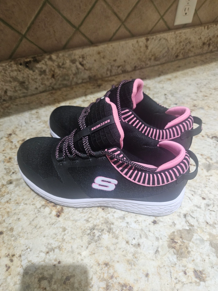Selling a pair of Skechers ladies' shoes in black with pink accents. They're in great condition and ready for a new home!