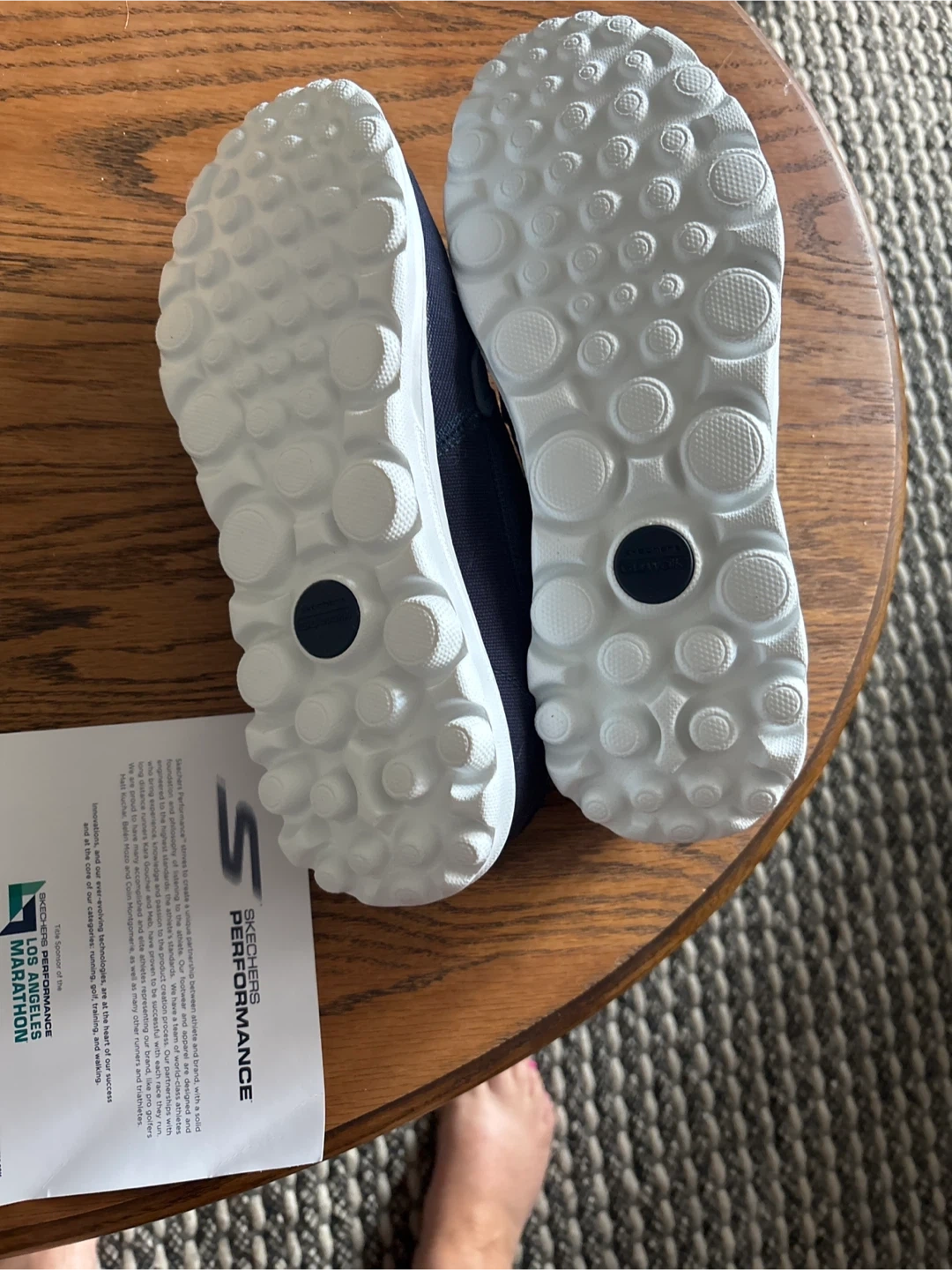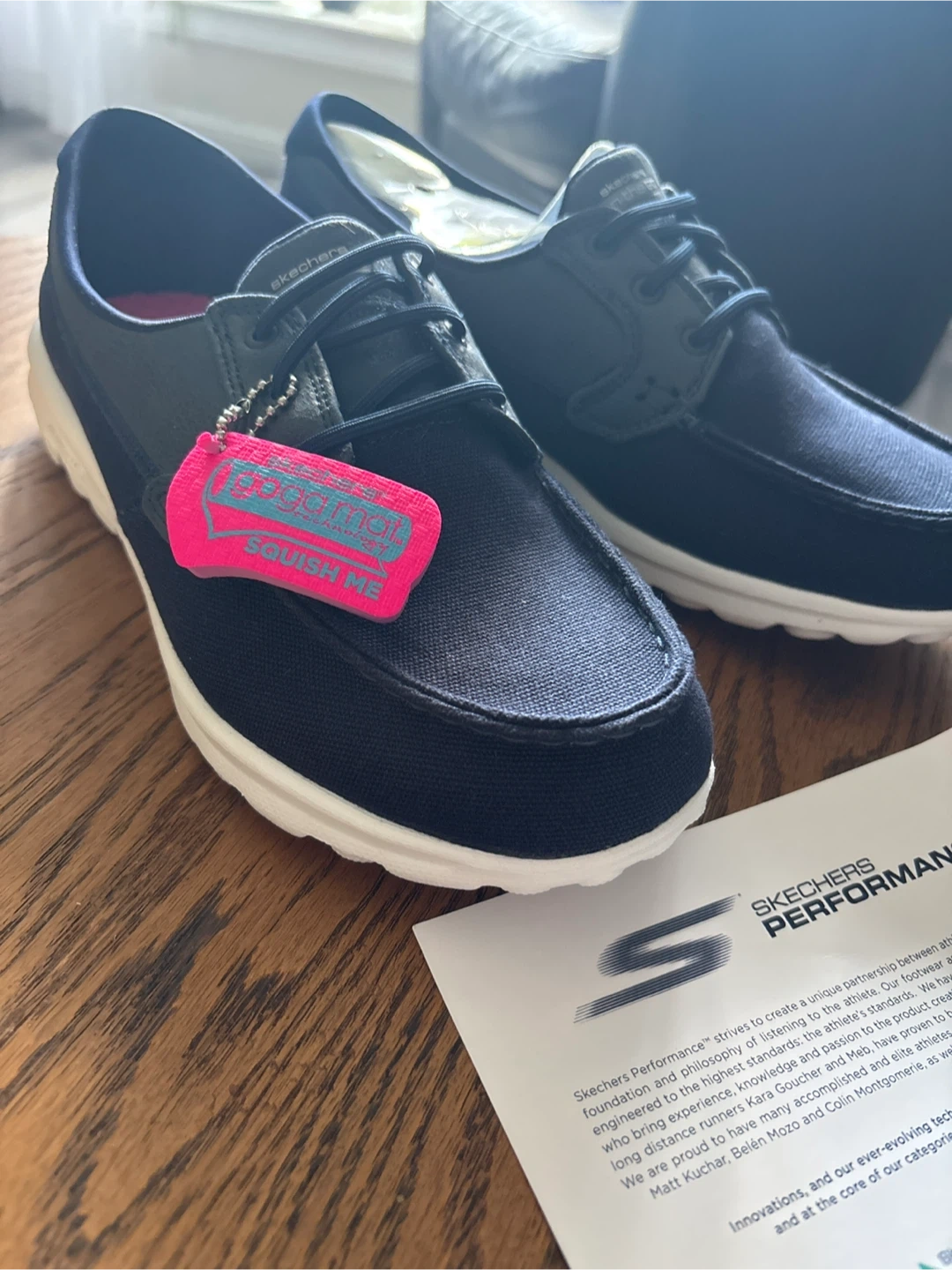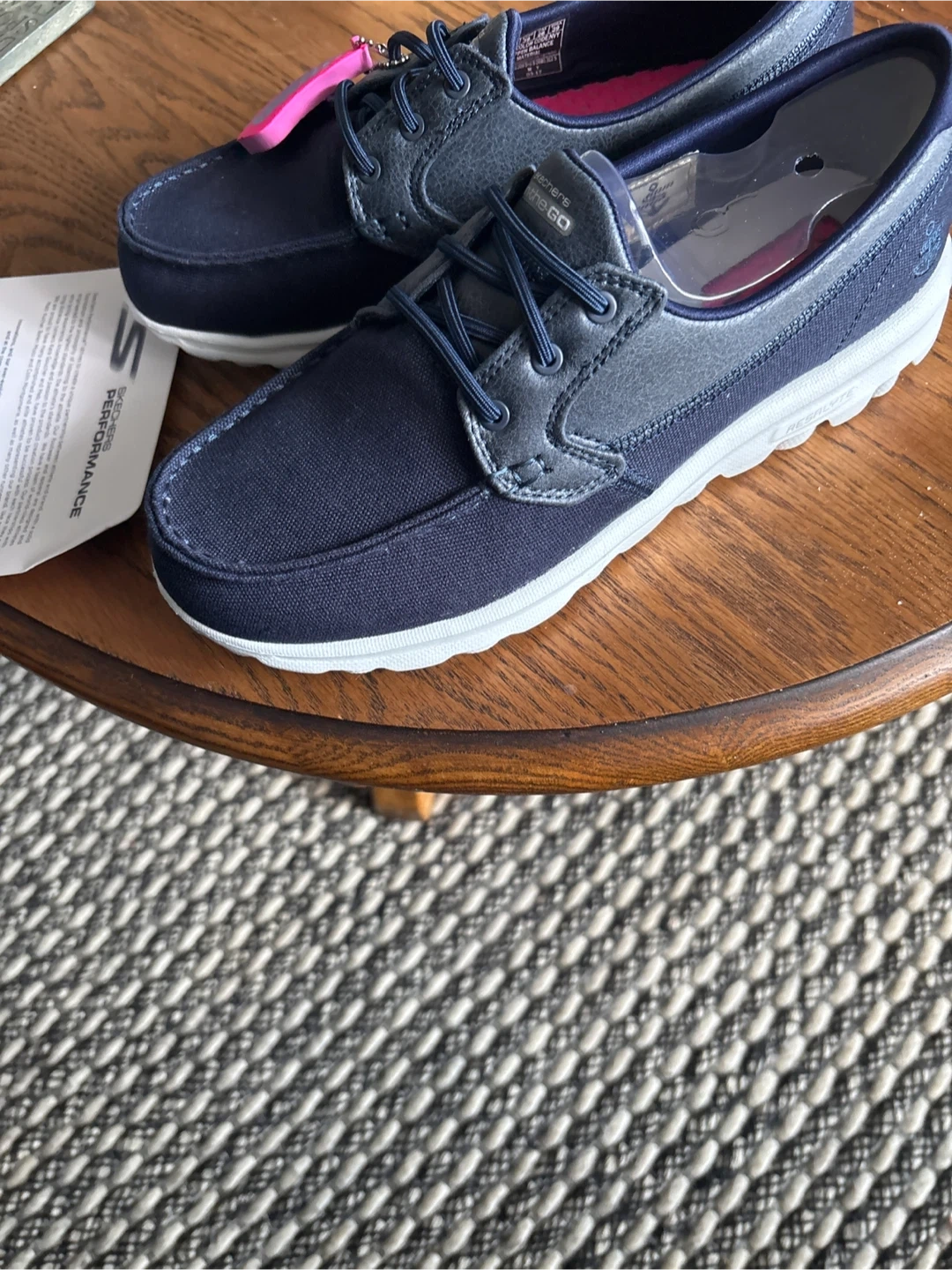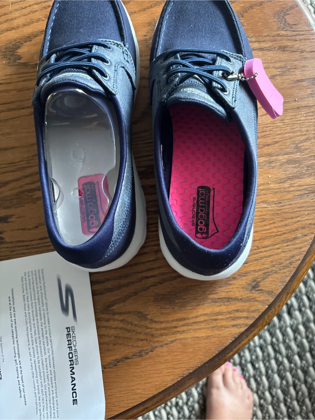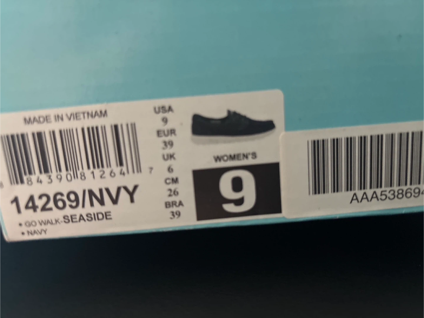 Selling a pair of Skechers GOwalk Seaside shoes in navy, size 9. They feature a comfortable GOga Mat insole and a lightweight design. Perfect for everyday wear!