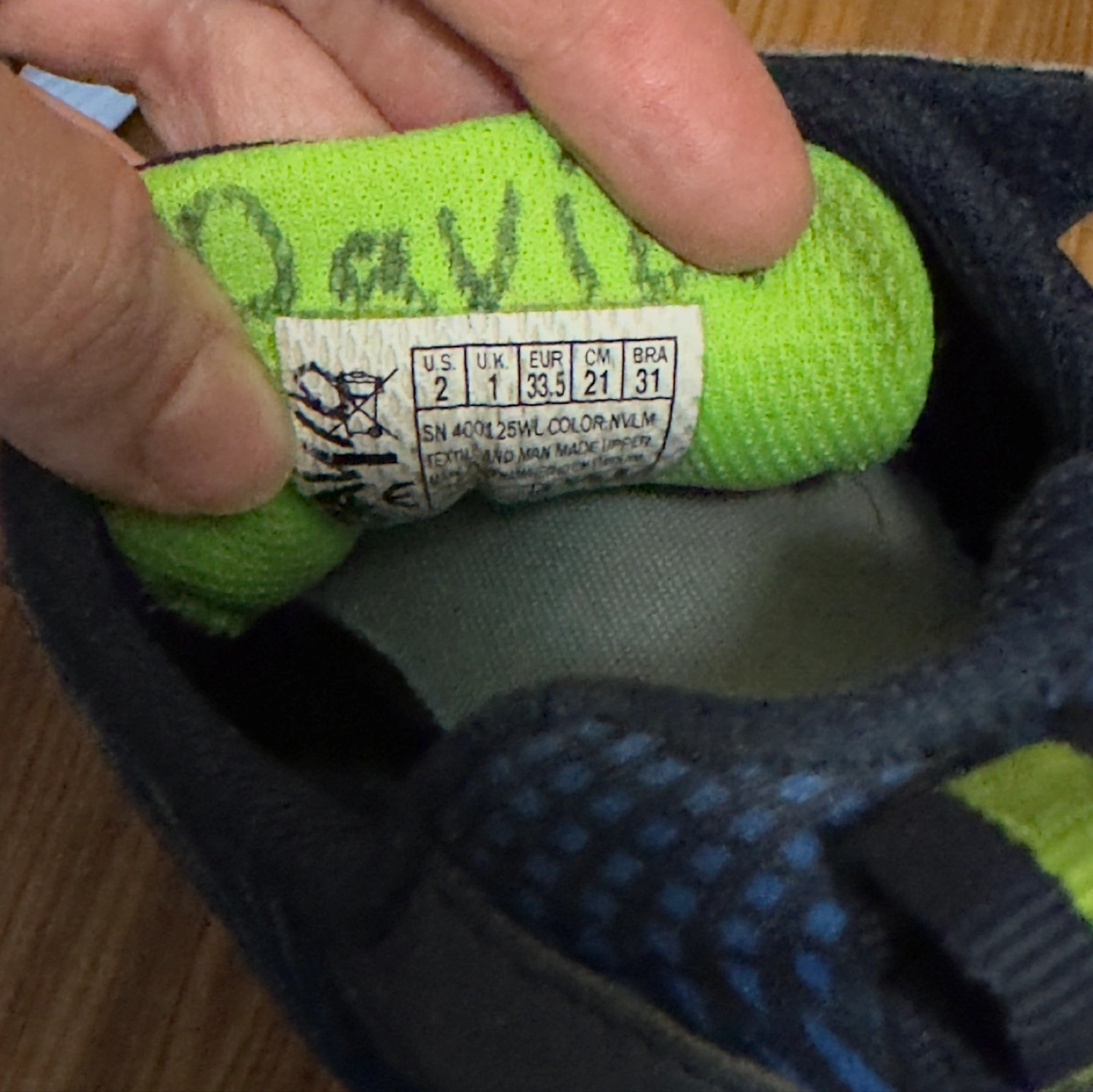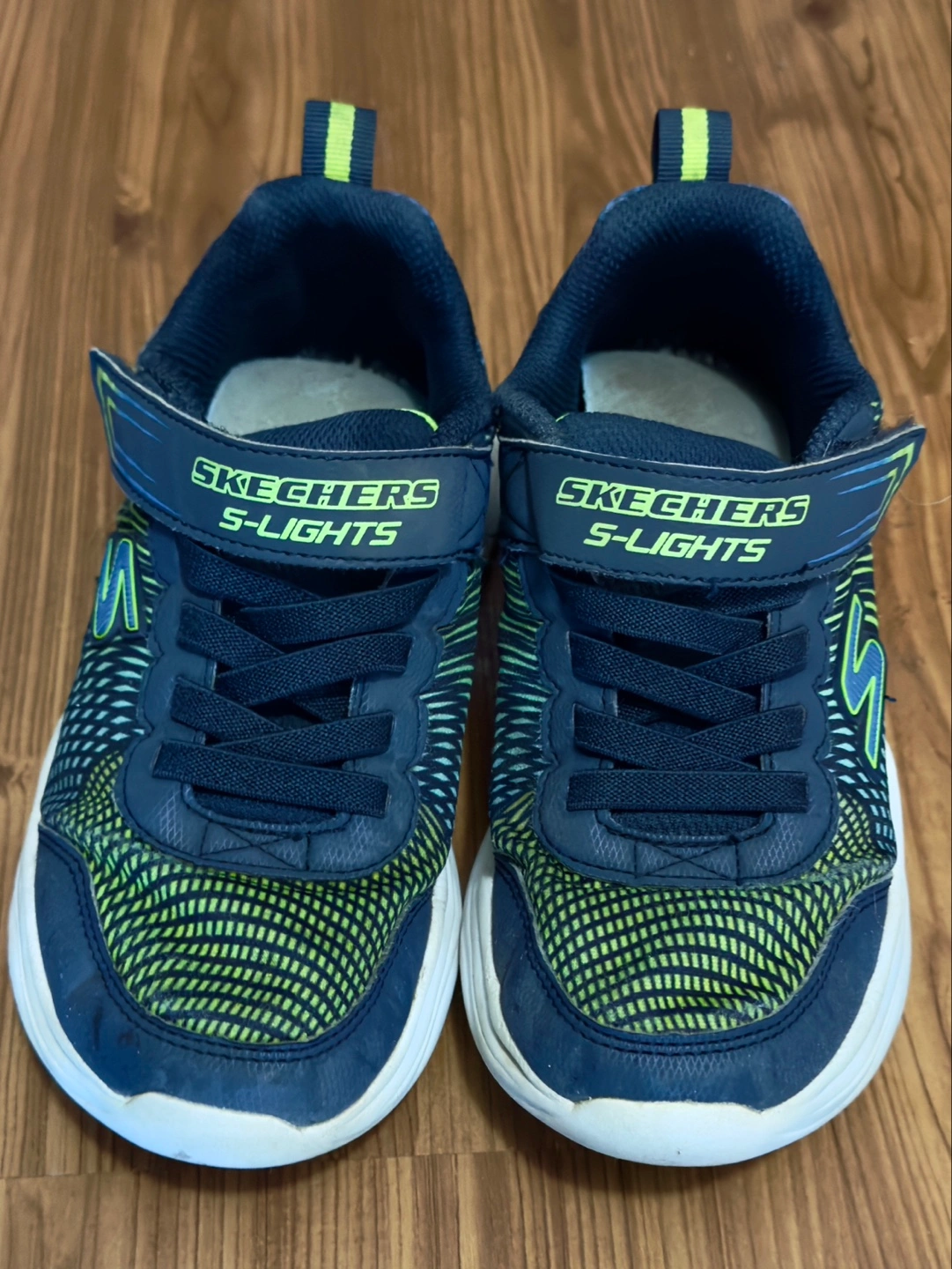 Pre-owned Skechers S-Lights running shoes. Size US 2, UK 1, EUR 33.5. Blue, green accents. Velcro closure. Good for active kids. Only available for pick up.