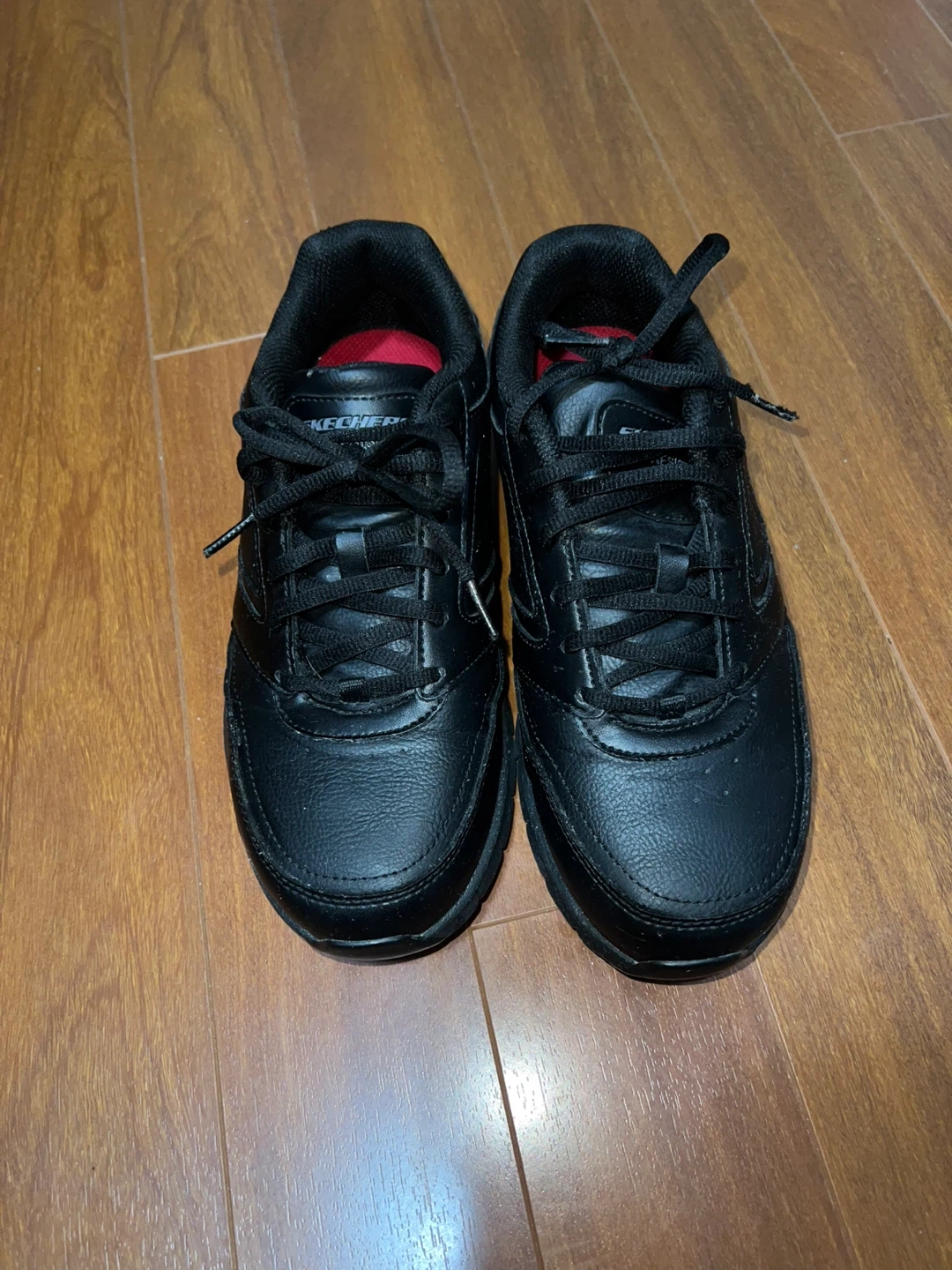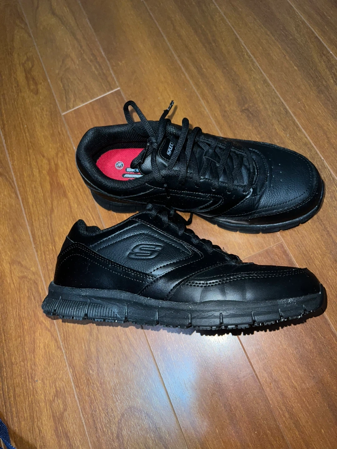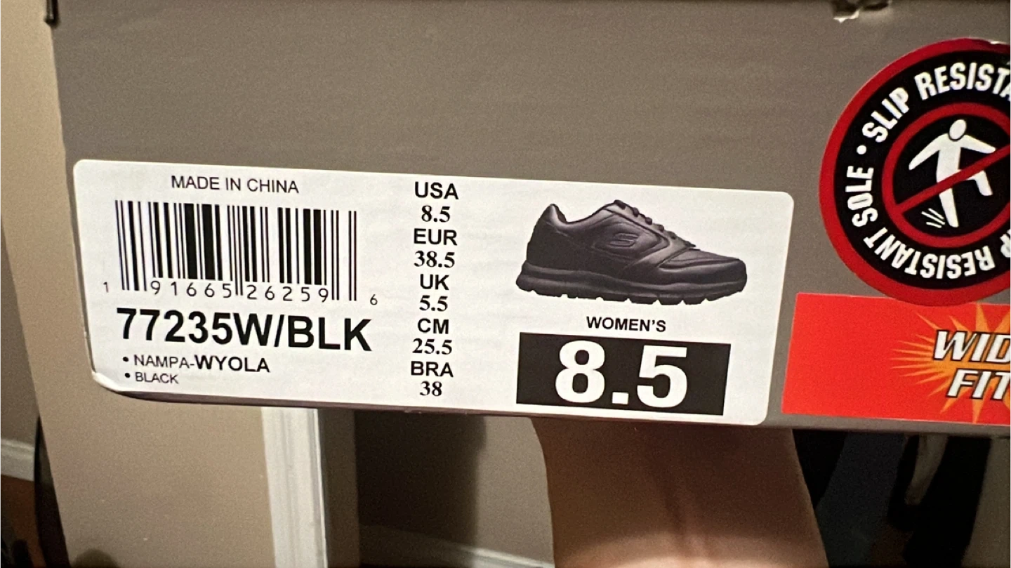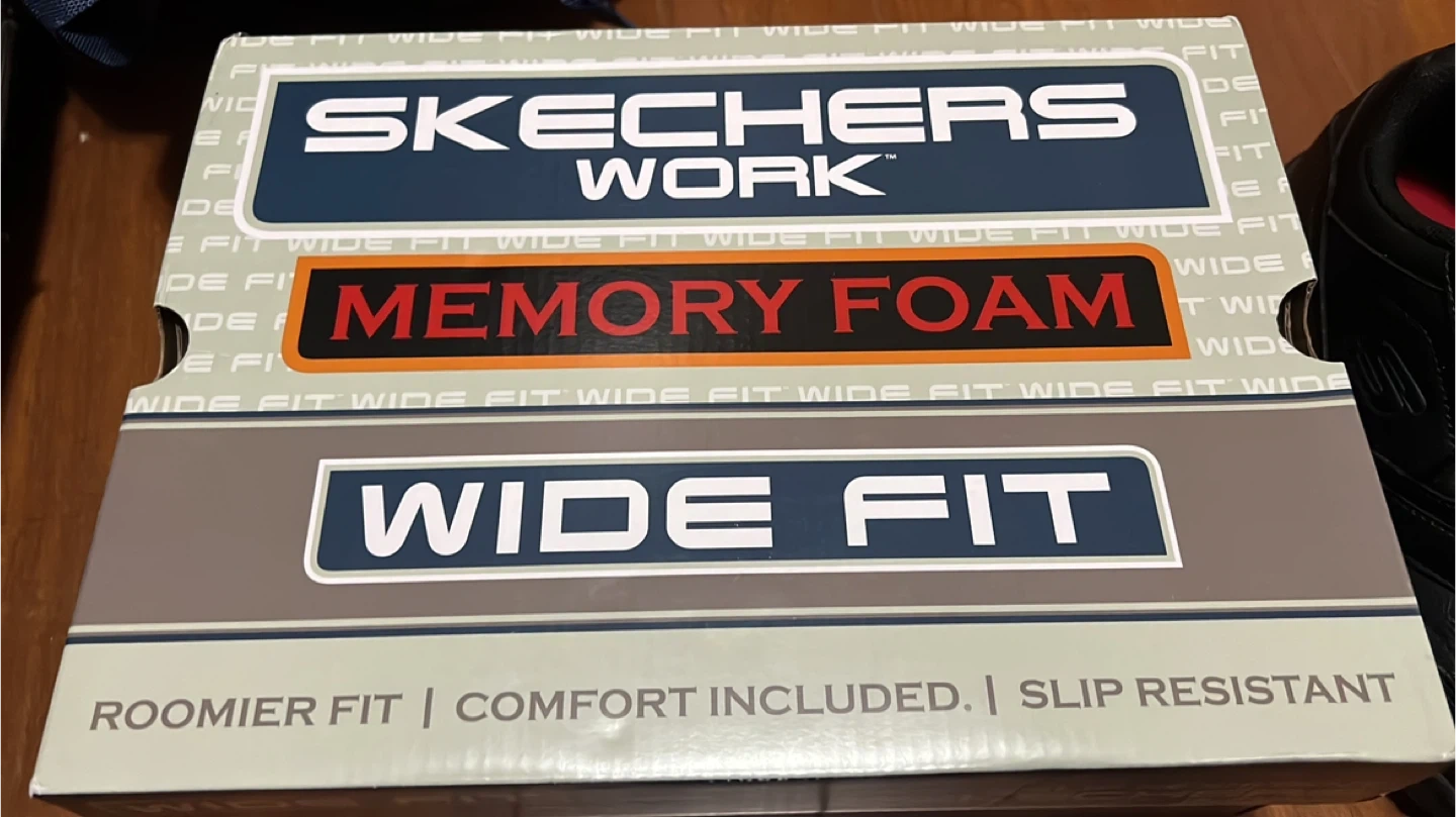 Selling a new pair of Skechers Work shoes in black, size 8.5. These feature memory foam for extra comfort and a wide fit. They are also slip resistant, perfect for workplace environments!