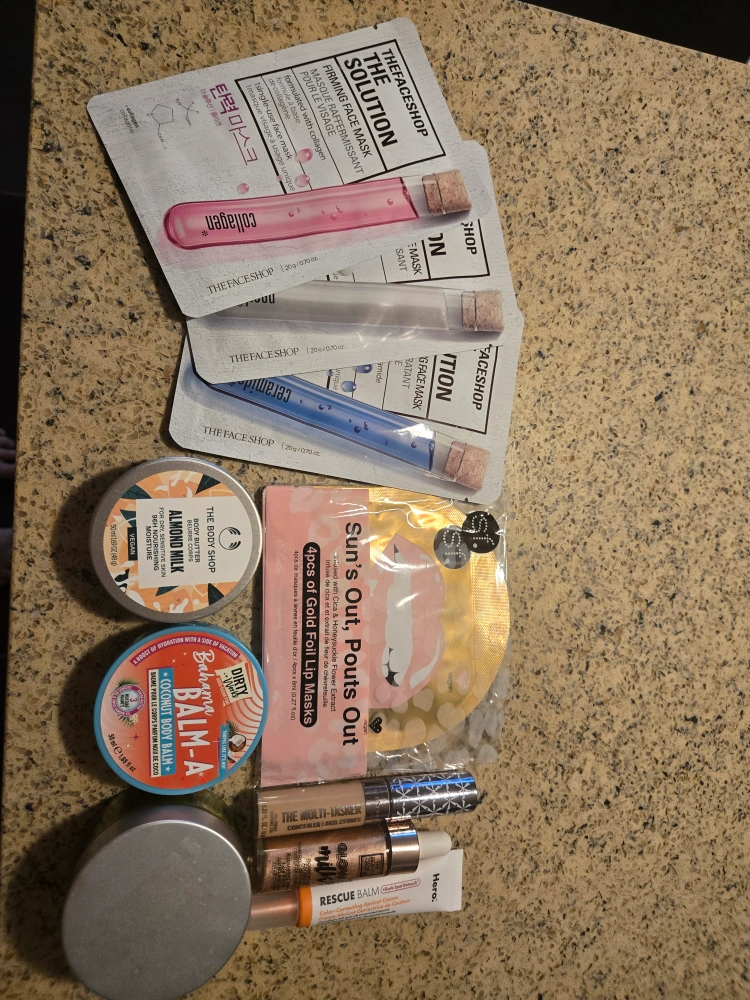 The Face Shop sheet masks, The Body Shop almond milk body butter, Dirty Works coconut body balm, body scrub, Sun's Out Pouts Out lip masks, Milk Makeup highlighter, Rimmel concealer, and Hero Cosmetics Rescue Balm. Not used. Selling as a whole bundle for $18. Pickup only. Smoke free and pet free home.