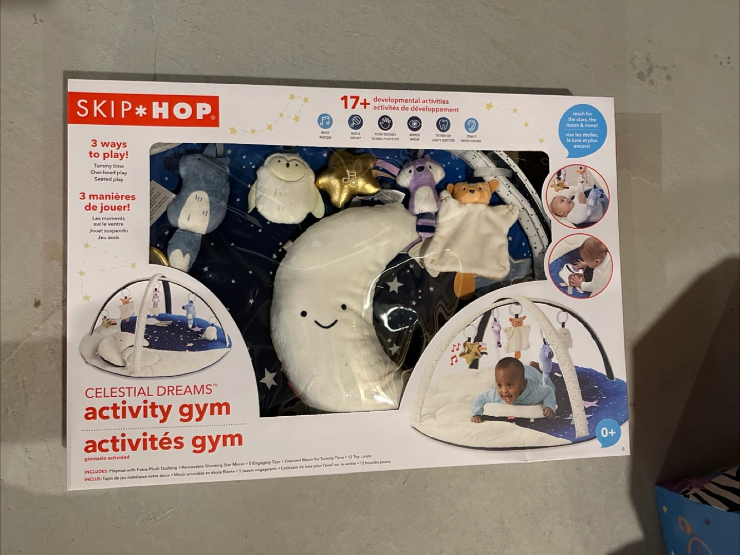 Baby playmat and gym. Features plush toys, a mirror, and a crescent moon. Three ways to play: tummy time, overhead play, and seated play. Brand new, never opened.
