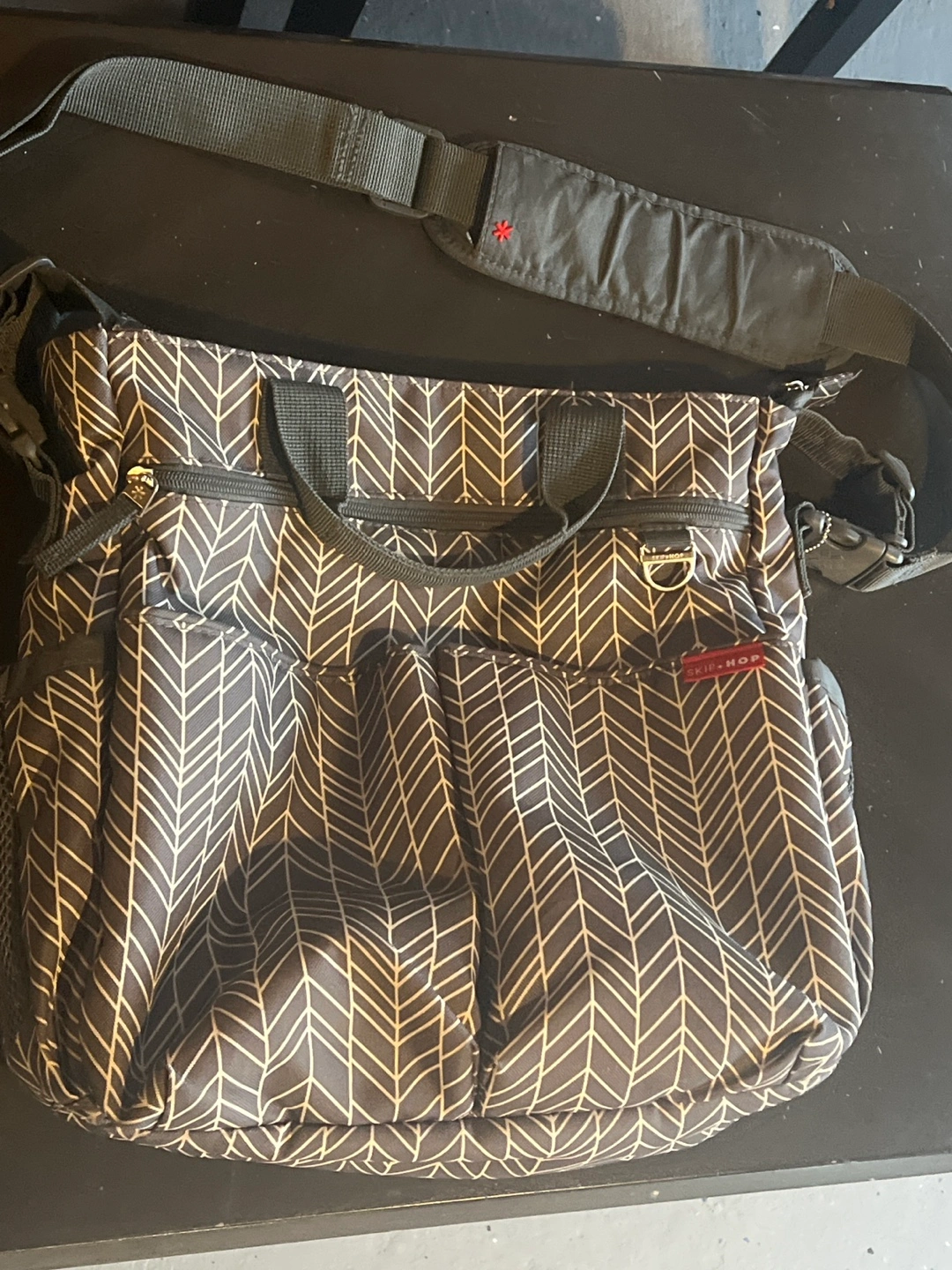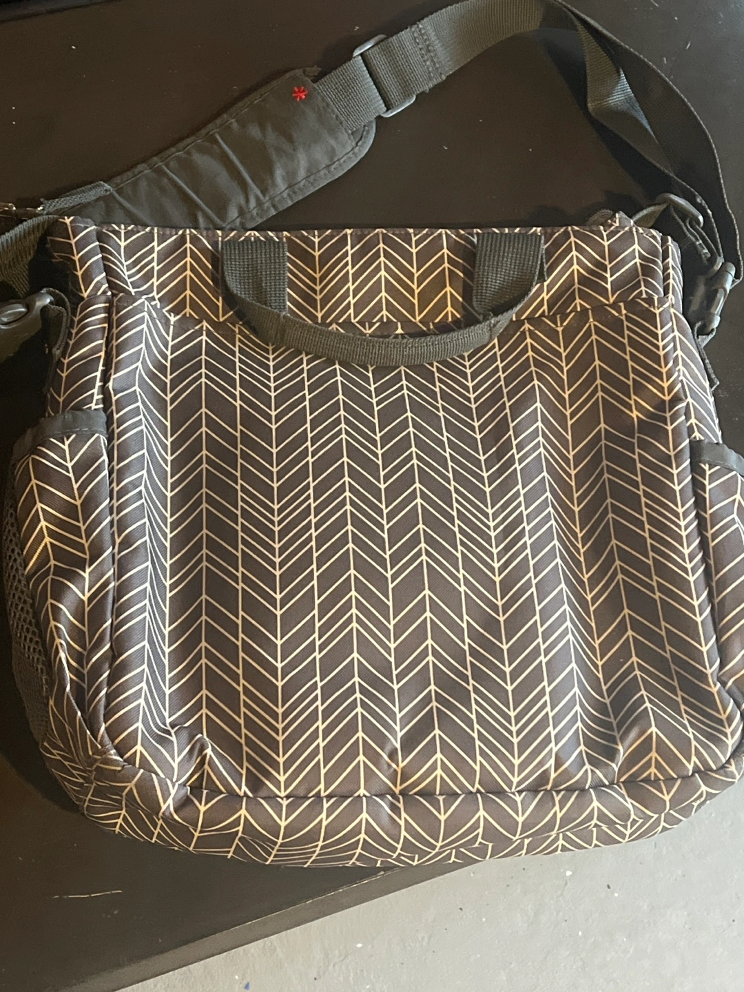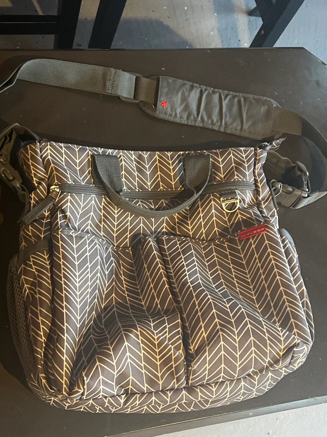 Selling a Skip Hop diaper bag with a stylish chevron pattern! It's in great condition and ready for a new home. This bag features multiple compartments and a comfortable shoulder strap, making it perfect for keeping all your baby essentials organized while you're on the go