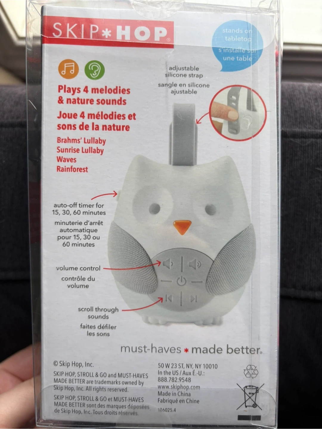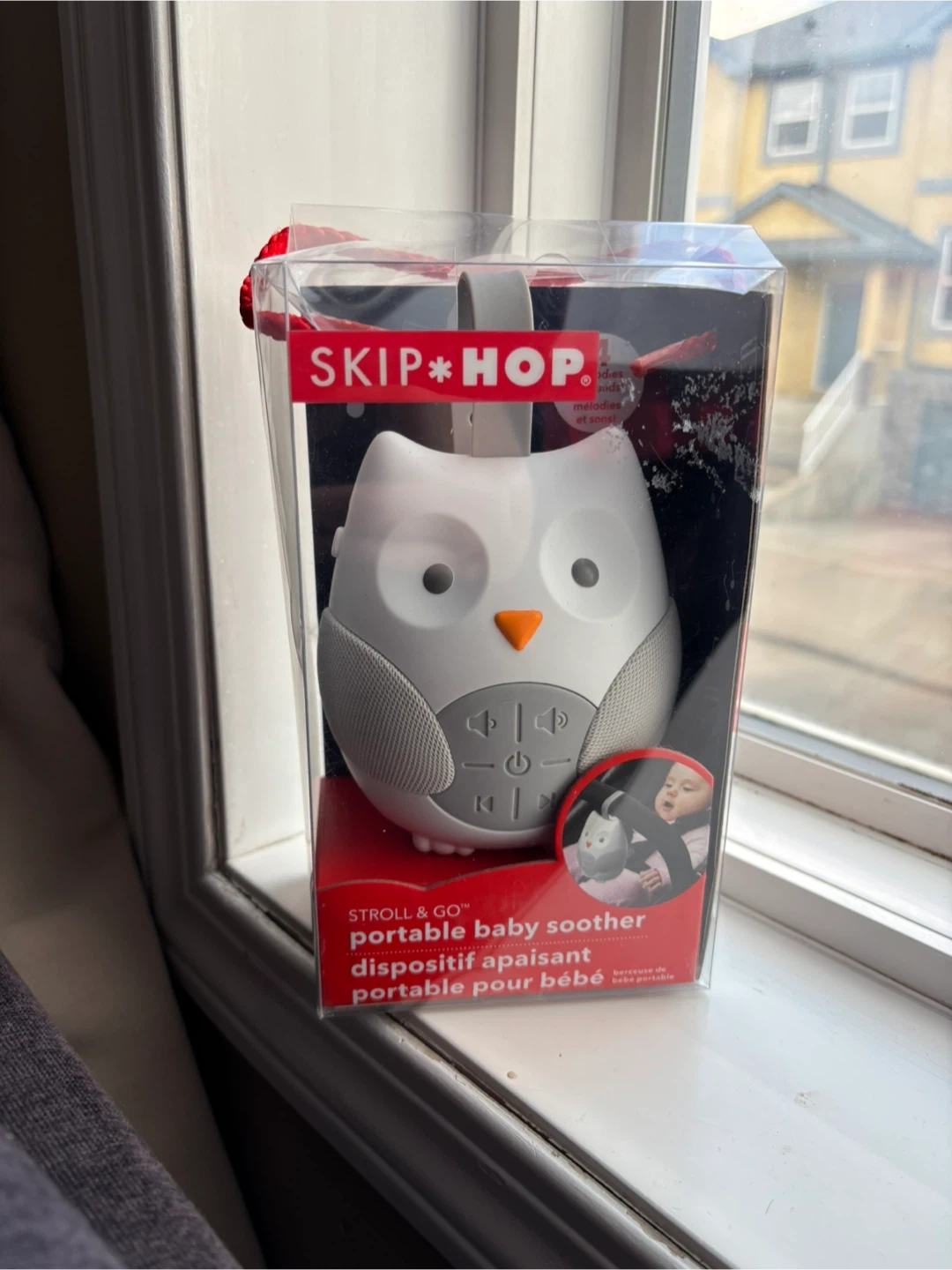 Selling a brand new Skip Hop Stroll & Go Portable Baby Soother! It plays 4 melodies and nature sounds, including Brahms' Lullaby, Sunrise Lullaby, Waves, and Rainforest. Features an auto-off timer for 15, 30, or 60 minutes, and adjustable volume control. Comes with an adjustable silicone strap so you can attach it to a stroller or tabletop