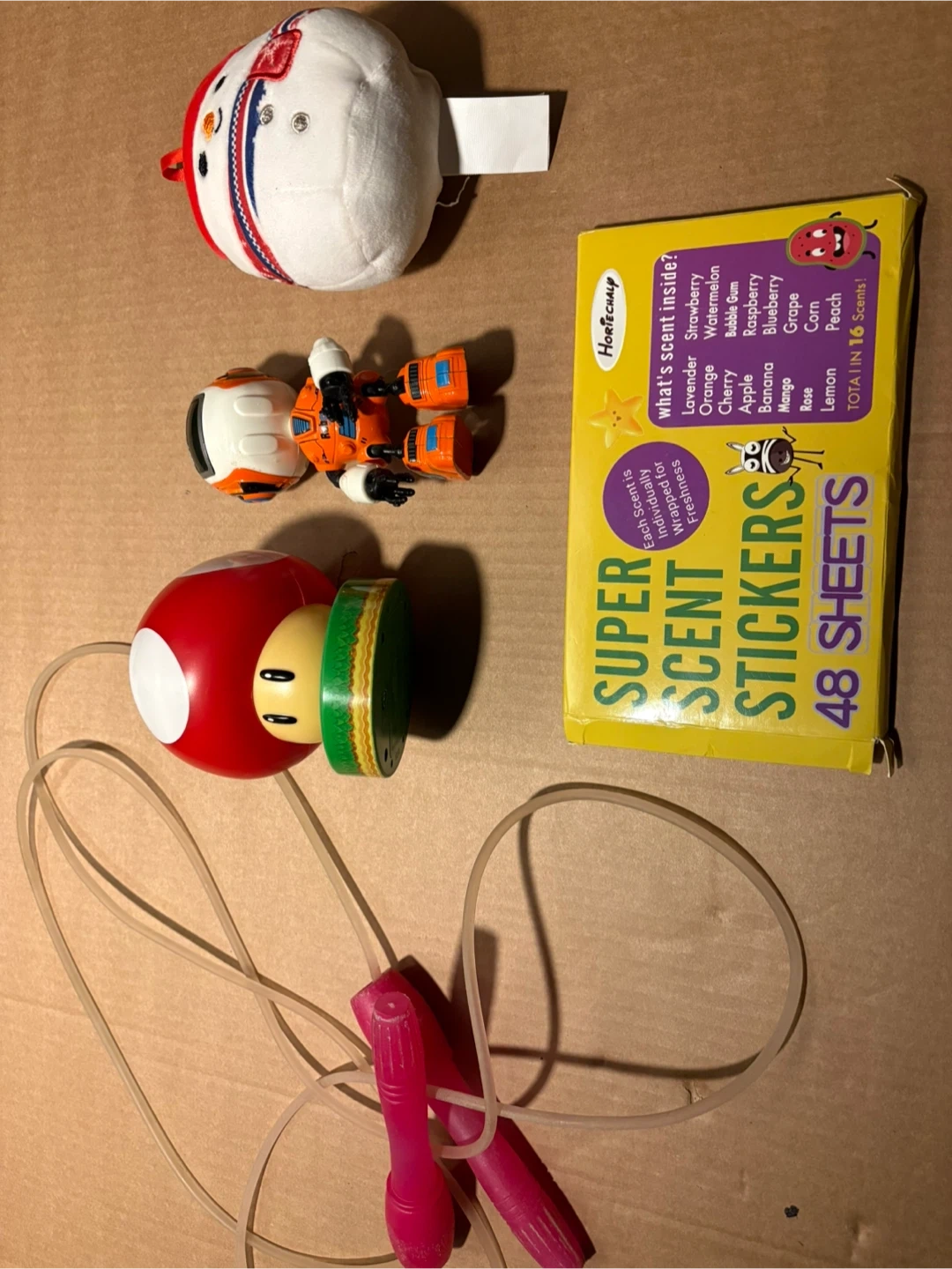 A skip rope, robot,mushroom light and a box of Super Scent Stickers! The box includes 48 sheets of stickers.each one is only 1$ and in total is 4$,Pick up at Morley trail NW